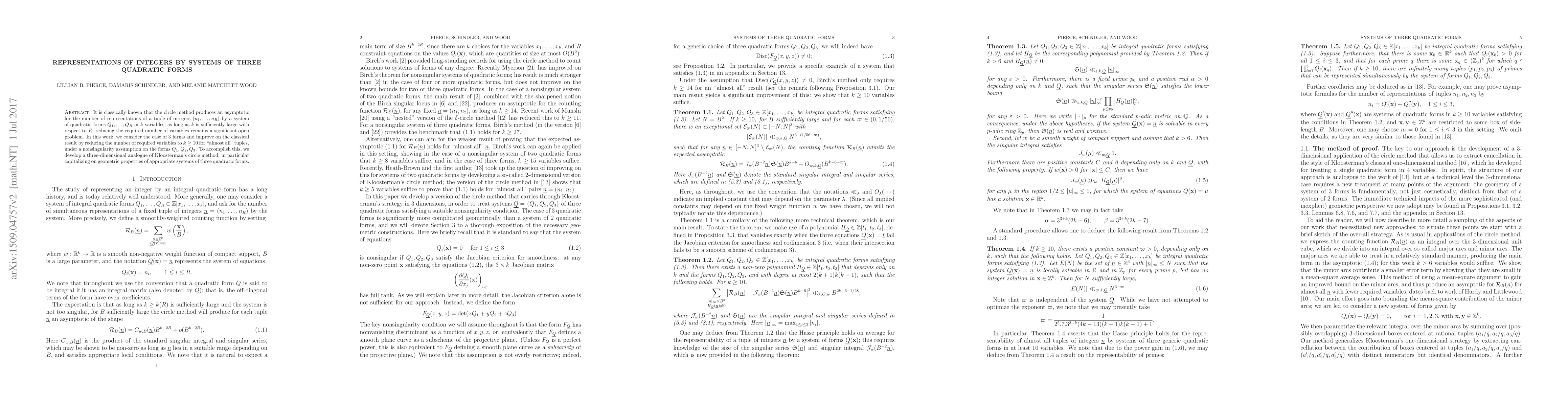 Researchers improved a method for counting representations of integers using systems of three quadratic forms, reducing the required number of variables from 'sufficiently large' to at least 10 in most cases.