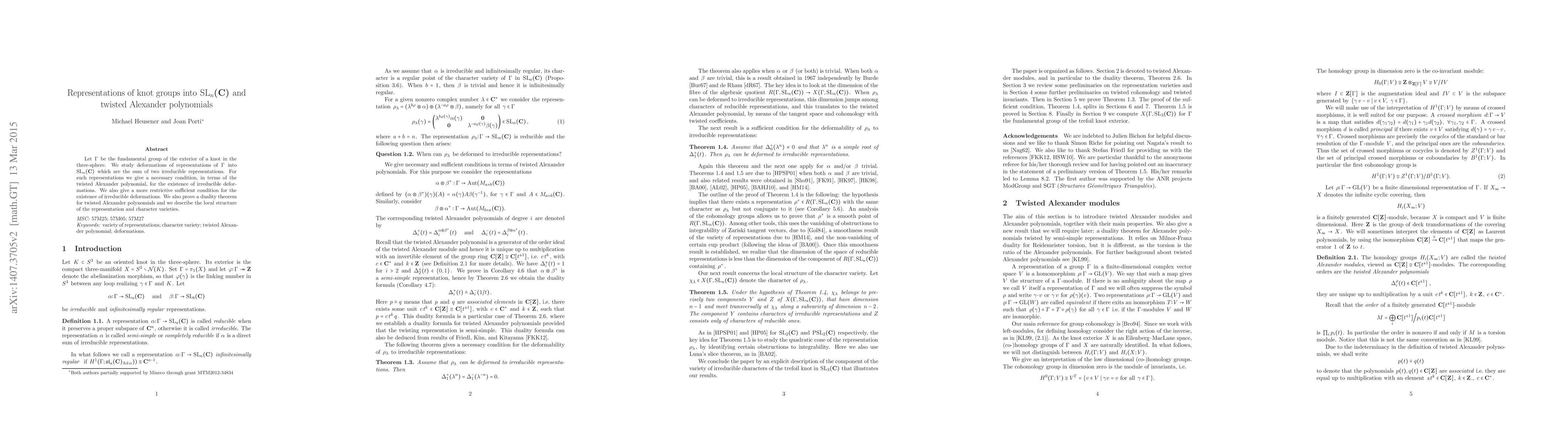 This paper investigates deformations of representations of knot group $\Gamma$ into $\mathrm{SL}_n(\mathbf{C})$, focusing on sums of two irreducible representations. It provides conditions for the existence of irreducible deformations in terms of twisted Alexander polynomials and proves a duality theorem for these polynomials.