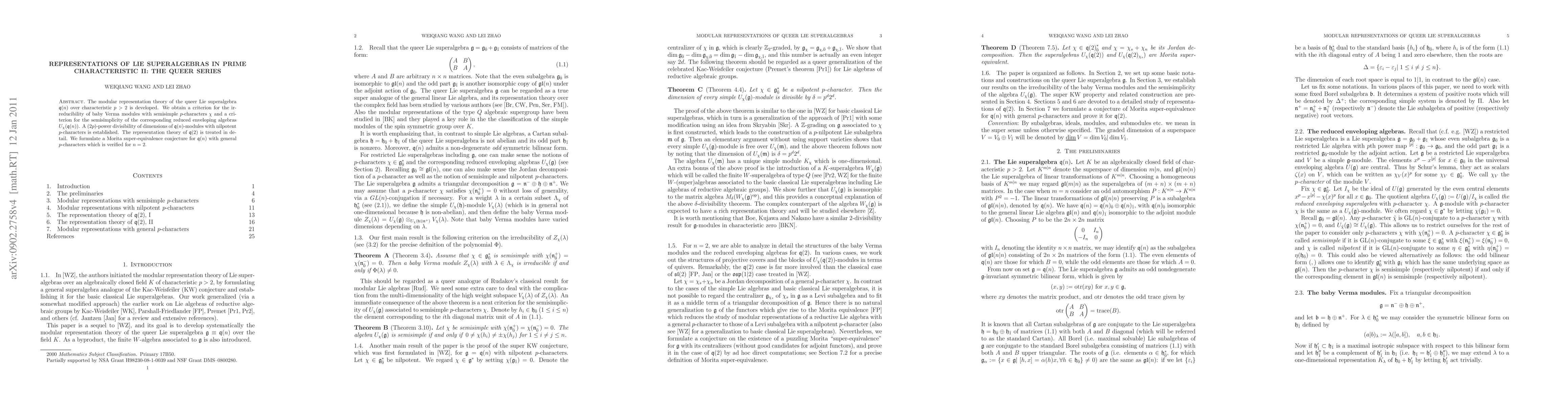 The modular representation theory of the queer Lie superalgebra q(n) over characteristic p>2 is developed. We obtain a criterion for the irreducibility of baby Verma modules with semisimple p-characters and a criterion for the semisimplicity of the corresponding reduced enveloping algebras. A (2p)-power divisibility of dimensions of q(n)-modules with nilpotent p-characters is established. The representation theory of q(2) is treated in detail. We formulate a Morita super-equivalence conjecture for q(n) with general p-characters which is verified for n=2.