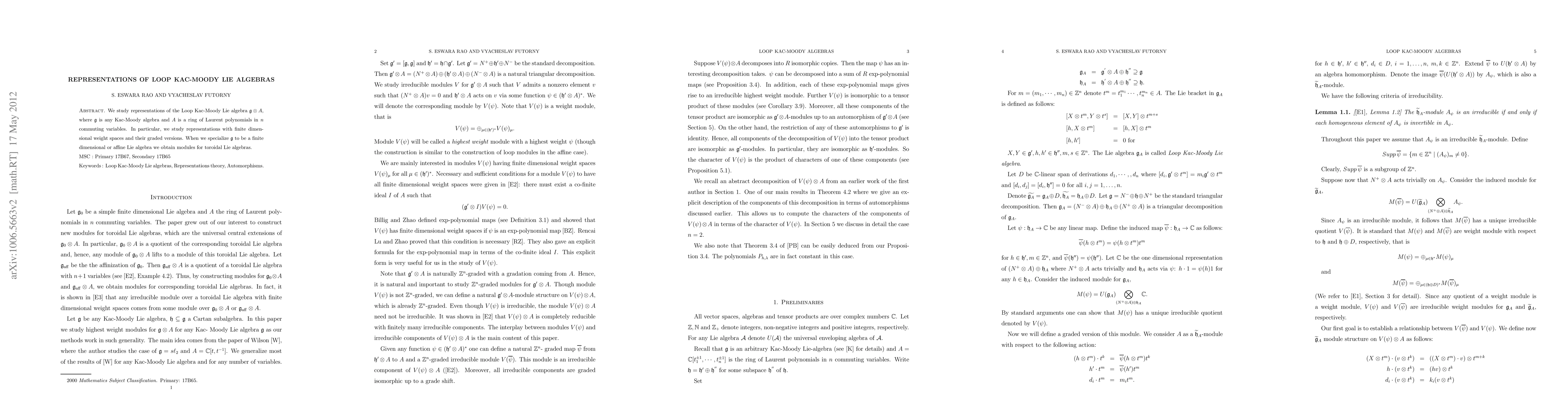 This paper investigates representations of the Loop Kac-Moody Lie algebra g ⊗ A, focusing on those with finite-dimensional weight spaces and their graded versions. Specializing to finite dimensional or affine Lie algebras results in modules for toroidal Lie algebras.