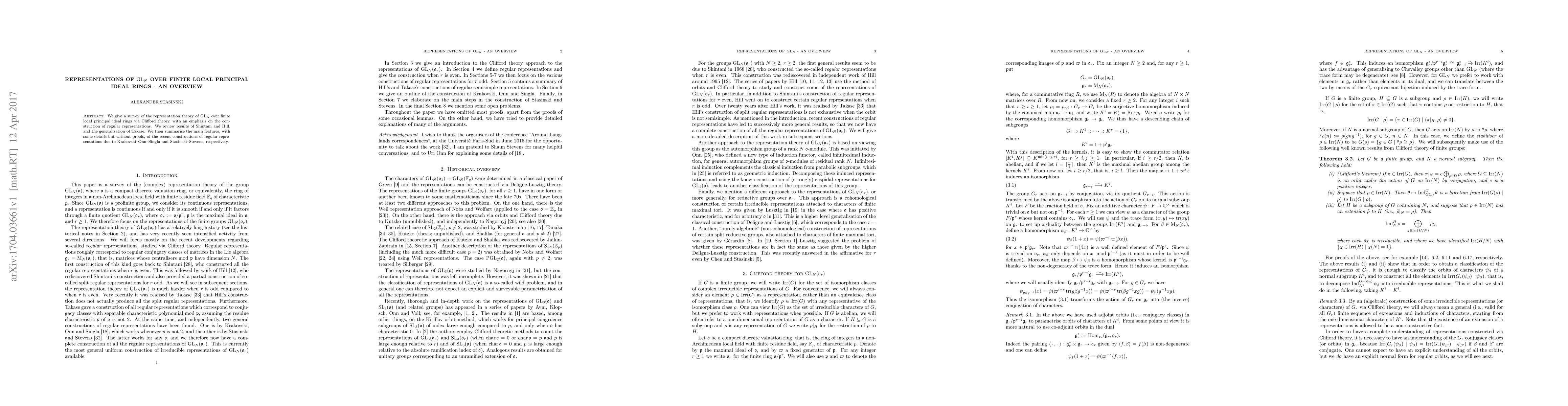 This paper surveys the representation theory of $\mathrm{GL}_N$ over finite local principal ideal rings, focusing on regular representations through Clifford theory. It reviews significant results from Shintani and Hill, and recent constructions by Krakovski-Onn-Singla and Stasinski-Stevens.