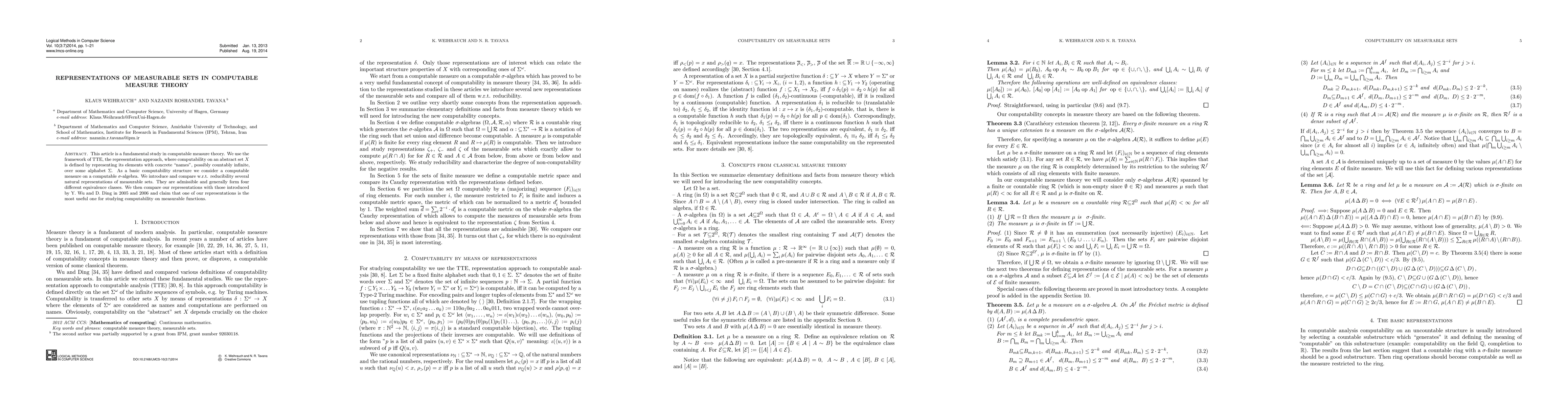 This paper explores computable measure theory using TTE's representation approach, defining computability via concrete "names" over an alphabet. It introduces and compares several representations of measurable sets, identifying four equivalence classes, and argues that one of these representations is superior for studying computability on measurable functions compared to prior work by Wu and Ding.
