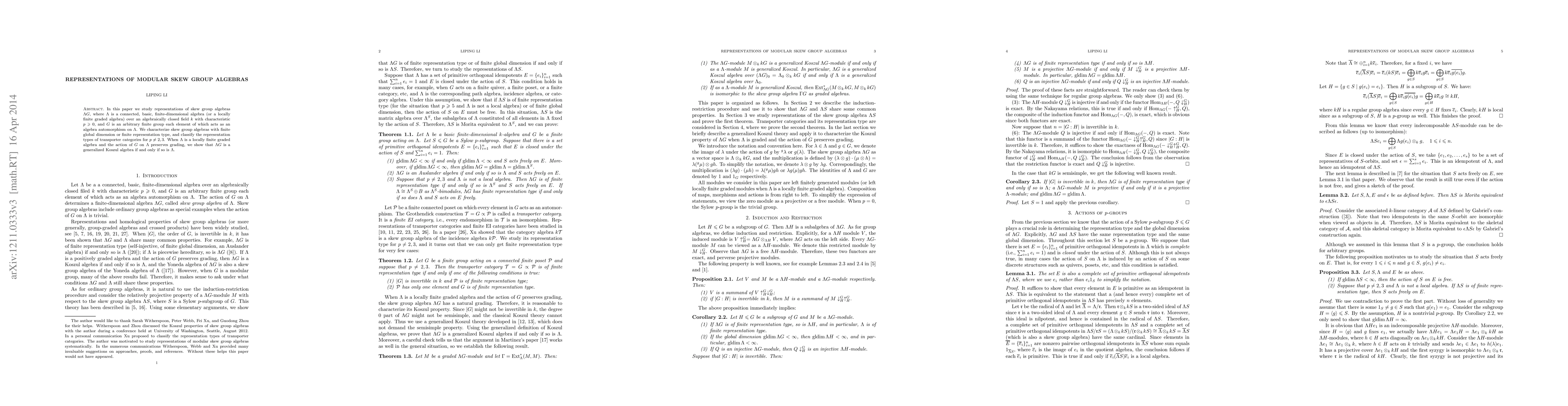 This paper characterizes and classifies representations of modular skew group algebras $\Lambda G$, where $\Lambda$ is a connected algebra and $G$ is a finite group acting on $\Lambda$. It establishes conditions for finite global dimension and representation type, and proves that $\Lambda G$ is generalized Koszul if $\Lambda$ is, under specific conditions.