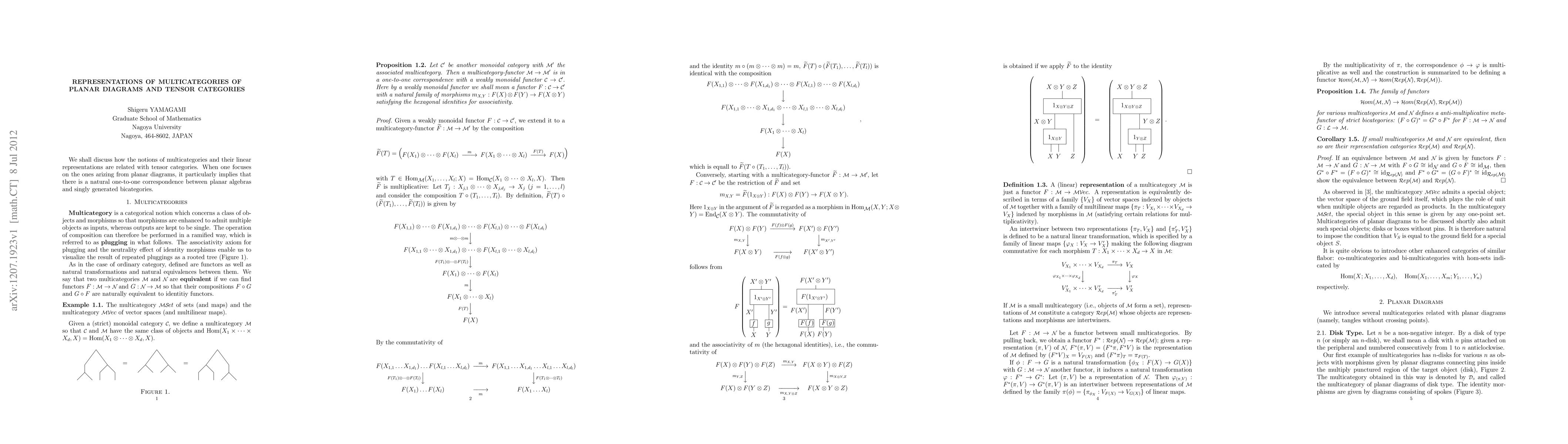We shall discuss how the notions of multicategories and their linear representations are related with tensor categories. When one focuses on the ones arizing from planar diagrams, it particularly implies that there is a natural one-to-one correspondence between planar algebras and singly generated bicategories.