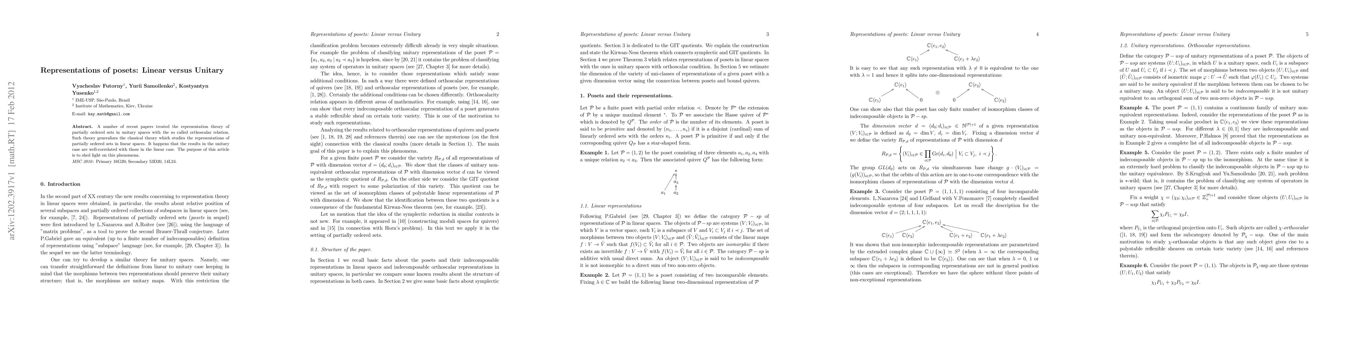 This paper explores the representation theory of partially ordered sets (posets) in both linear and unitary spaces, highlighting the similarities between the two frameworks and elucidating how results in unitary spaces correlate with those in linear spaces.