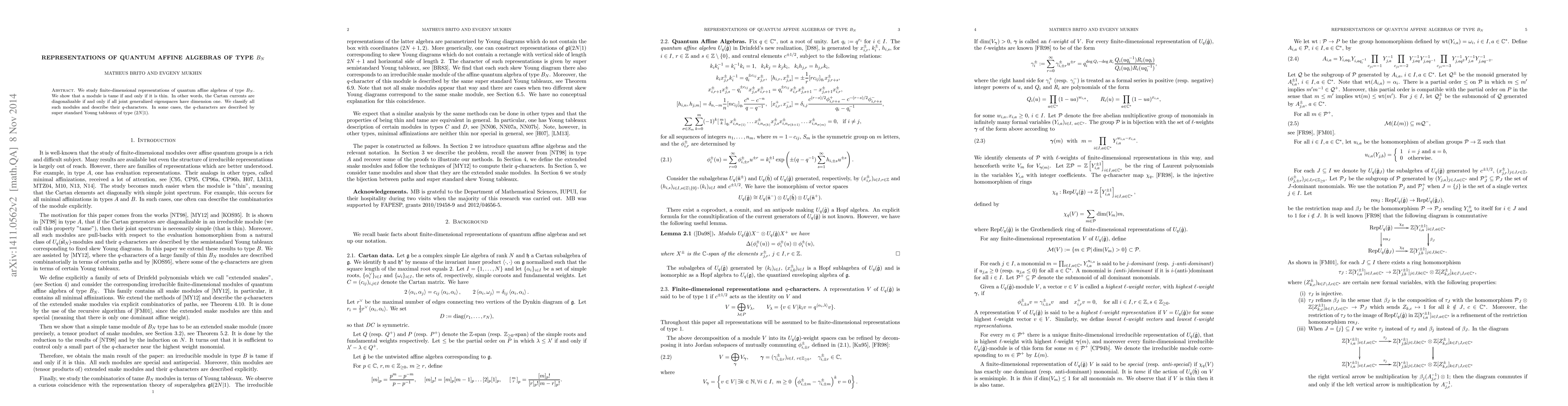 We study finite-dimensional representations of quantum affine algebras of type $B_N$. We show that a module is tame if and only if it is thin. In other words, the Cartan currents are diagonalizable if and only if all joint generalized eigenspaces have dimension one. We classify all such modules and describe their $q$-characters. In some cases, the $q$-characters are described by super standard Young tableaux of type $(2N|1)$.