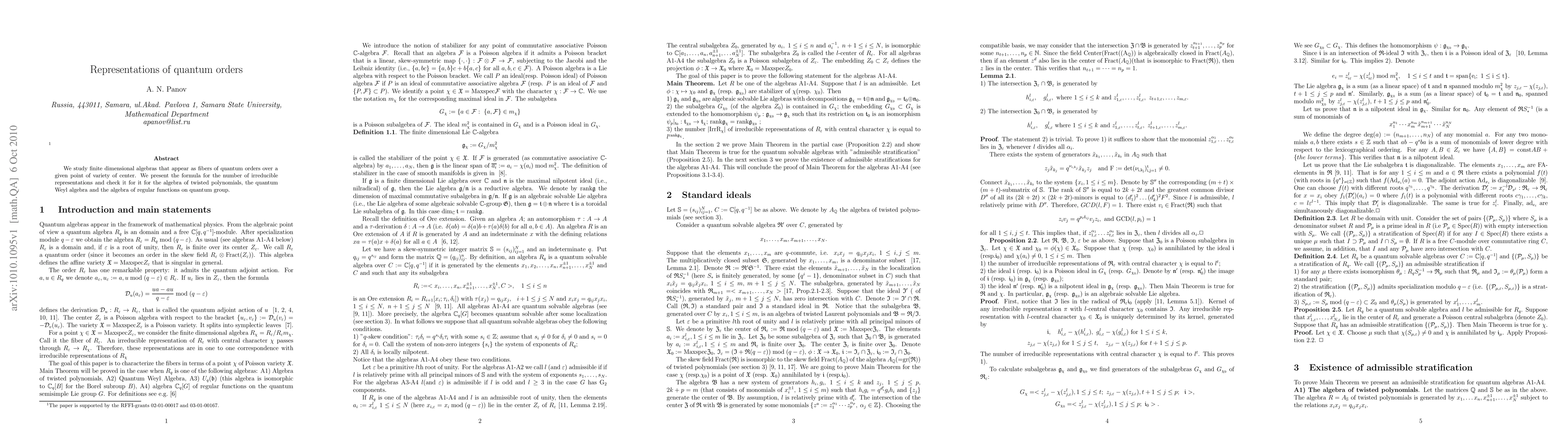 We study finite dimensional algebras that appear as fibers of quantum orders over a given point of variety of center. We present the formula for the number of irreducible representations and check it for it for the algebra of twisted polynomials, the quantum Weyl algebra and the algebra of regular functions on quantum group.