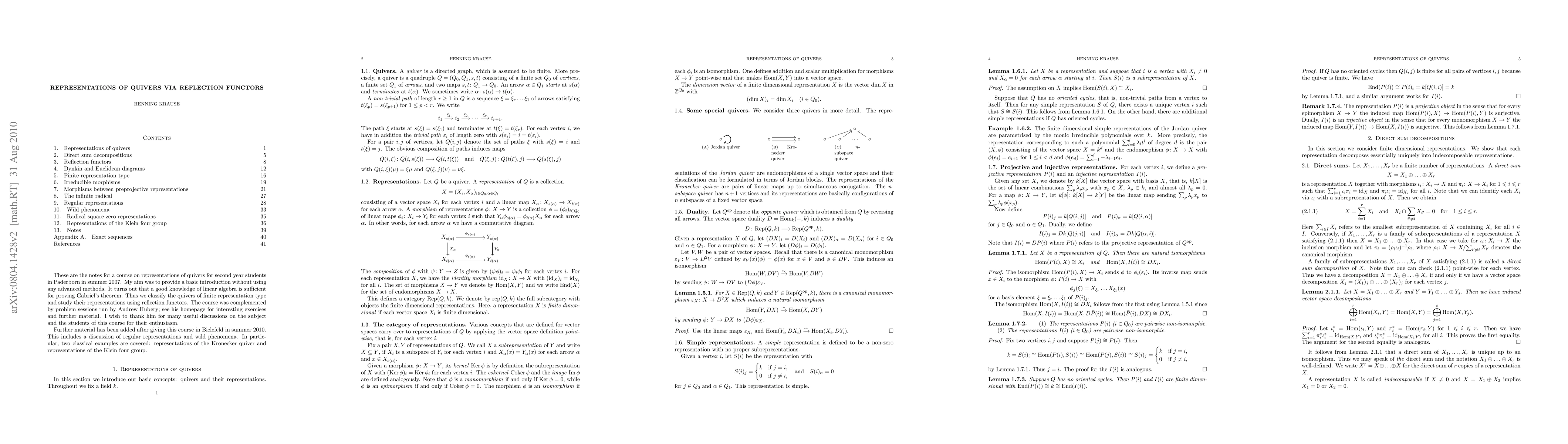This paper introduces second-year students to quiver representations, focusing on basic linear algebra and Gabriel's theorem. It classifies quivers of finite representation type using reflection functors and discusses regular representations and wild phenomena, with specific examples on Kronecker quiver and Klein four group representations.