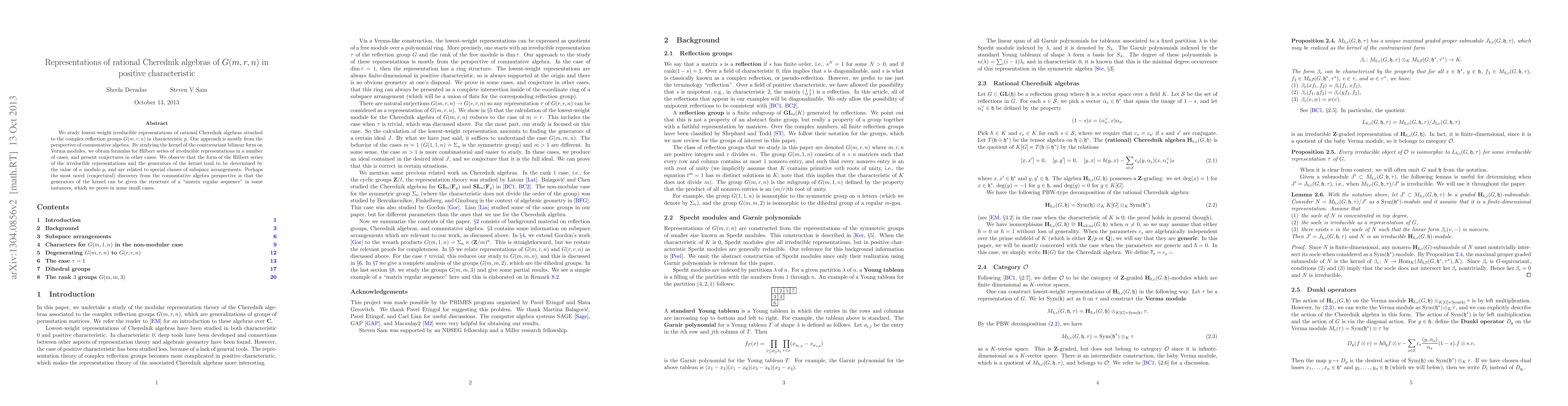 This paper investigates lowest-weight irreducible representations of rational Cherednik algebras associated with G(m,r,n) groups in positive characteristic, using commutative algebra techniques. It provides formulas for Hilbert series and conjectures based on the value of n modulo p, revealing a "matrix regular sequence" structure in some cases.