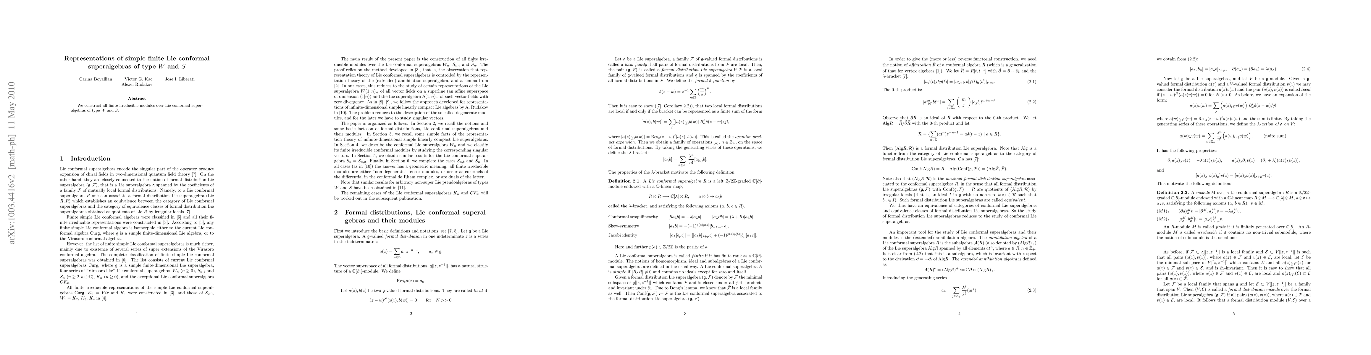 Summary: This paper constructs all finite irreducible modules for two specific types of simple finite Lie conformal superalgebras, referred to as W and S, providing a comprehensive representation theory for these structures.
