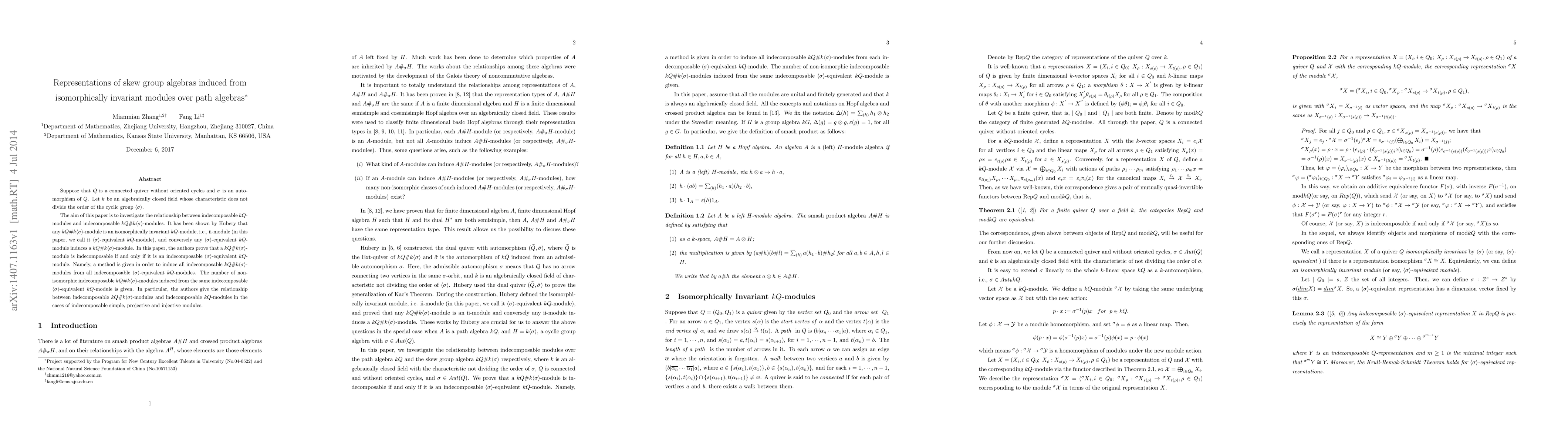 Suppose that $Q$ is a connected quiver without oriented cycles and $\sigma$ is an automorphism of $Q$. Let $k$ be an algebraically closed field whose characteristic does not divide the order of the cyclic group $\langle\sigma\rangle$. The aim of this paper is to investigate the relationship between indecomposable $kQ$-modules and indecomposable $kQ\#k\langle\sigma\rangle$-modules. It has been shown by Hubery that any $kQ\#k\langle\sigma\rangle$-module is an isomorphically invariant $kQ$-module, i.e., ii-module (in this paper, we call it $\langle\sigma\rangle$-equivalent $kQ$-module), and conversely any $\langle\sigma\rangle$-equivalent $kQ$-module induces a $kQ\#k\langle\sigma\rangle$-module. In this paper, the authors prove that a $kQ\#k\langle\sigma\rangle$-module is indecomposable if and only if it is an indecomposable $\langle\sigma\rangle$-equivalent $kQ$-module. Namely, a method is given in order to induce all indecomposable $kQ\#k\langle\sigma\rangle$-modules from all indecomposable $\langle\sigma\rangle$-equivalent $kQ$-modules. The number of non-isomorphic indecomposable $kQ\#k\langle\sigma\rangle$-modules induced from the same indecomposable $\langle\sigma\rangle$-equivalent $kQ$-module is given. In particular, the authors give the relationship between indecomposable $kQ\#k\langle\sigma\rangle$-modules and indecomposable $kQ$-modules in the cases of indecomposable simple, projective and injective modules.