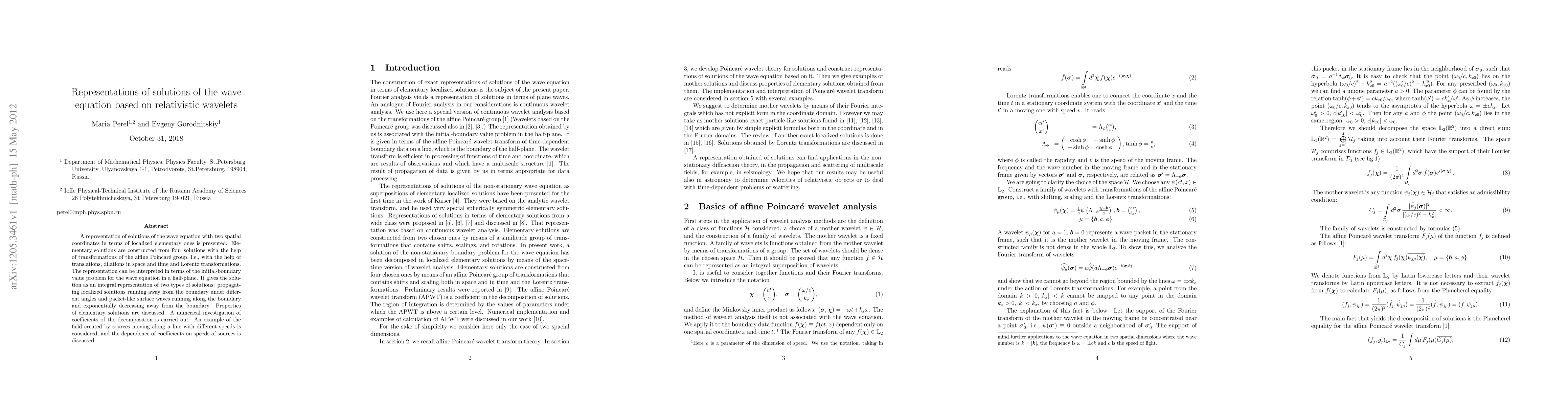 A representation of solutions of the wave equation with two spatial coordinates in terms of localized elementary ones is presented. Elementary solutions are constructed from four solutions with the help of transformations of the affine Poincar\'e group, i.e., with the help of translations, dilations in space and time and Lorentz transformations. The representation can be interpreted in terms of the initial-boundary value problem for the wave equation in a half-plane. It gives the solution as an integral representation of two types of solutions: propagating localized solutions running away from the boundary under different angles and packet-like surface waves running along the boundary and exponentially decreasing away from the boundary. Properties of elementary solutions are discussed. A numerical investigation of coefficients of the decomposition is carried out. An example of the field created by sources moving along a line with different speeds is considered, and the dependence of coefficients on speeds of sources is discussed.