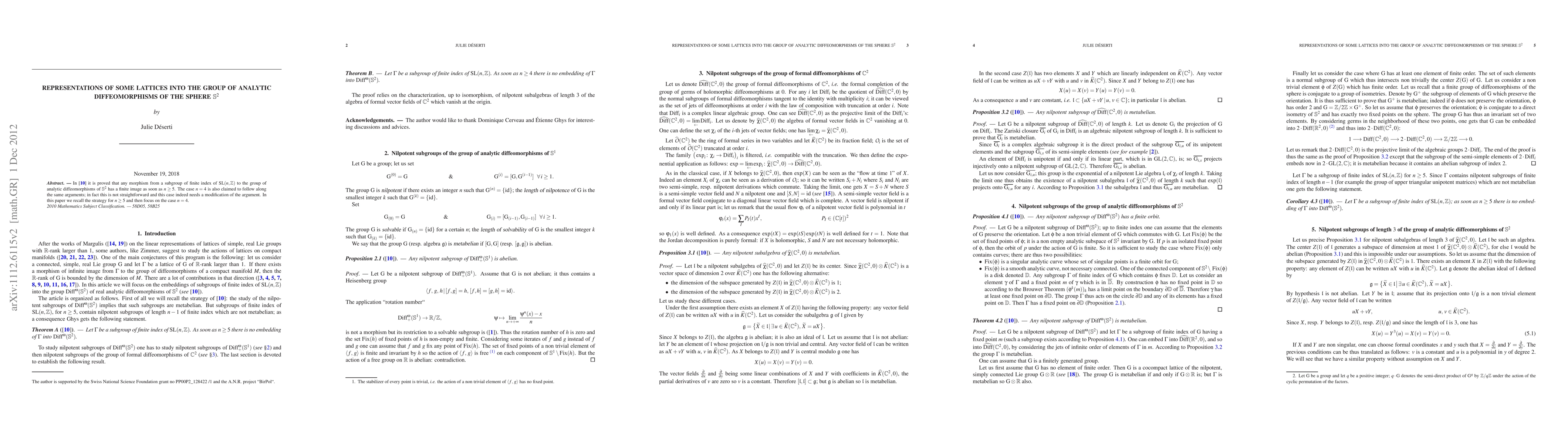 In \cite{Ghys} it is proved that any morphism from a subgroup of finite index of $\mathrm{SL}(n,\mathbb{Z})$ to the group of analytic diffeomorphisms of $\mathbb{S}^2$ has a finite image as soon as $n\geq 5$. The case $n=4$ is also claimed to follow along the same arguments; in fact this is not straightforward and this case indeed needs a modification of the argument. In this paper we recall the strategy for $n\geq 5$ and then focus on the case $n=4$.