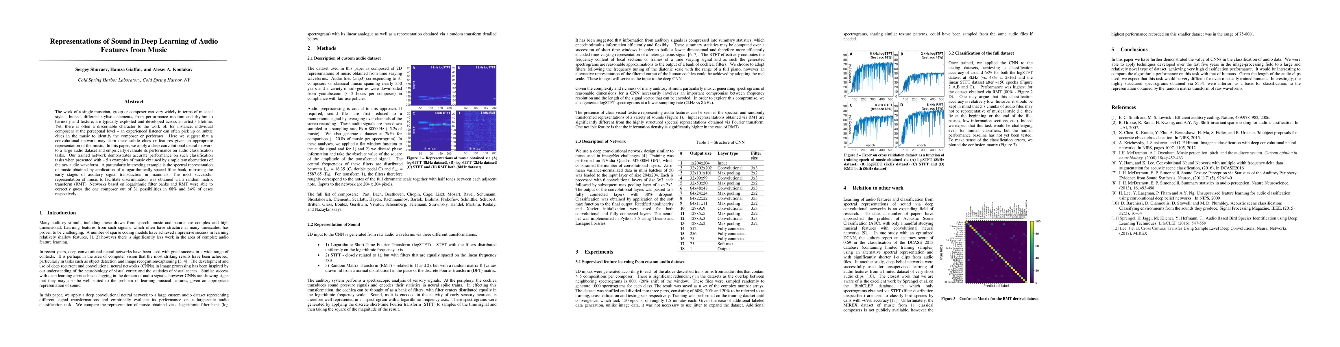 The work of a single musician, group or composer can vary widely in terms of musical style. Indeed, different stylistic elements, from performance medium and rhythm to harmony and texture, are typically exploited and developed across an artist's lifetime. Yet, there is often a discernable character to the work of, for instance, individual composers at the perceptual level - an experienced listener can often pick up on subtle clues in the music to identify the composer or performer. Here we suggest that a convolutional network may learn these subtle clues or features given an appropriate representation of the music. In this paper, we apply a deep convolutional neural network to a large audio dataset and empirically evaluate its performance on audio classification tasks. Our trained network demonstrates accurate performance on such classification tasks when presented with 5 s examples of music obtained by simple transformations of the raw audio waveform. A particularly interesting example is the spectral representation of music obtained by application of a logarithmically spaced filter bank, mirroring the early stages of auditory signal transduction in mammals. The most successful representation of music to facilitate discrimination was obtained via a random matrix transform (RMT). Networks based on logarithmic filter banks and RMT were able to correctly guess the one composer out of 31 possibilities in 68 and 84 percent of cases respectively.