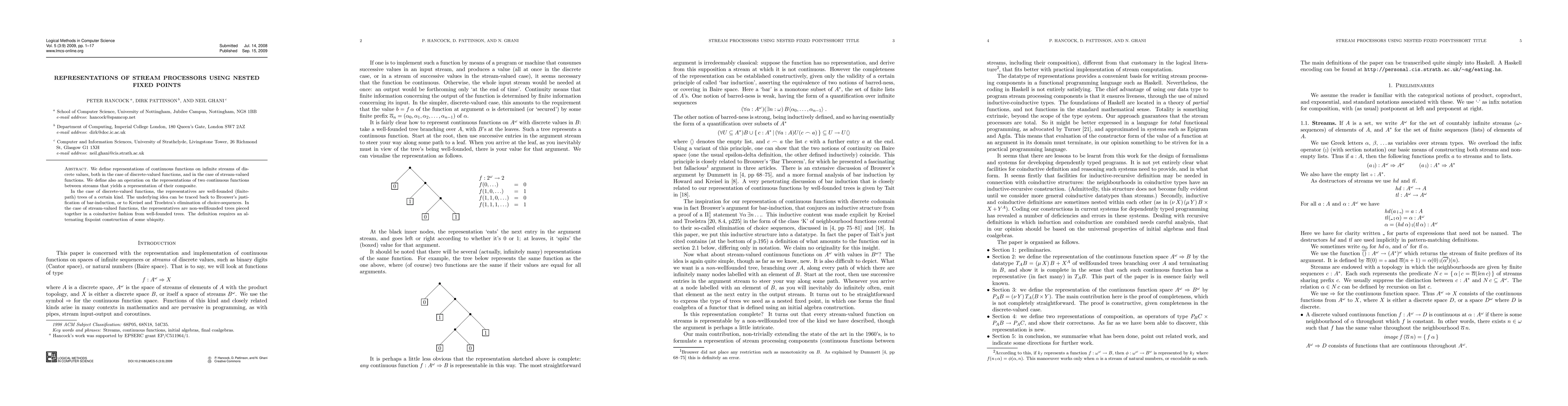 We define representations of continuous functions on infinite streams of discrete values, both in the case of discrete-valued functions, and in the case of stream-valued functions. We define also an operation on the representations of two continuous functions between streams that yields a representation of their composite. In the case of discrete-valued functions, the representatives are well-founded (finite-path) trees of a certain kind. The underlying idea can be traced back to Brouwer's justification of bar-induction, or to Kreisel and Troelstra's elimination of choice-sequences. In the case of stream-valued functions, the representatives are non-wellfounded trees pieced together in a coinductive fashion from well-founded trees. The definition requires an alternating fixpoint construction of some ubiquity.
