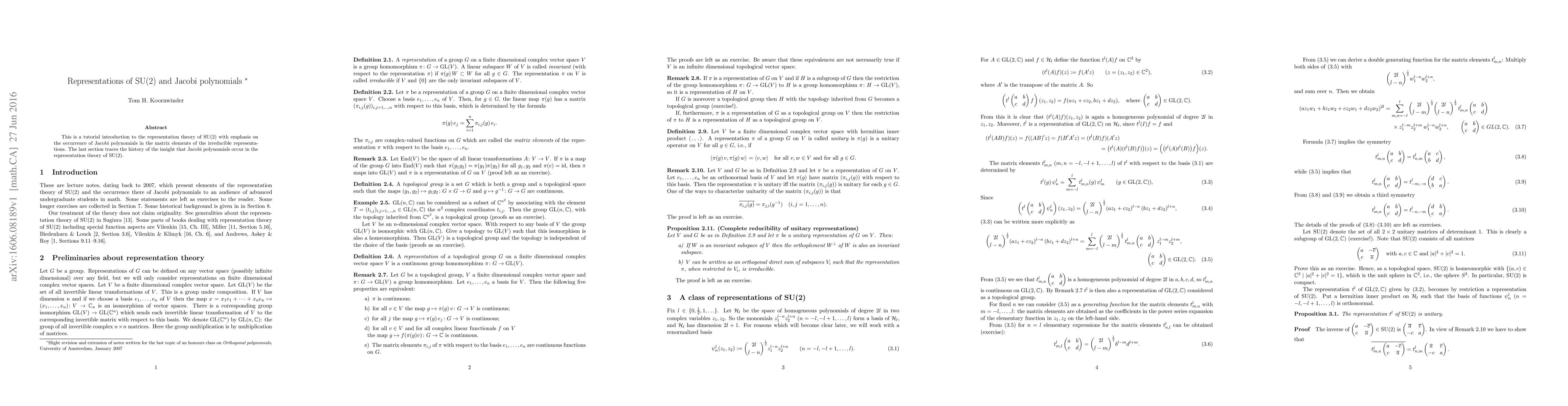 This paper provides an introduction to the representation theory of SU(2), highlighting the role of Jacobi polynomials in the matrix elements of its irreducible representations, and concludes with a historical account of the recognition of this mathematical connection.