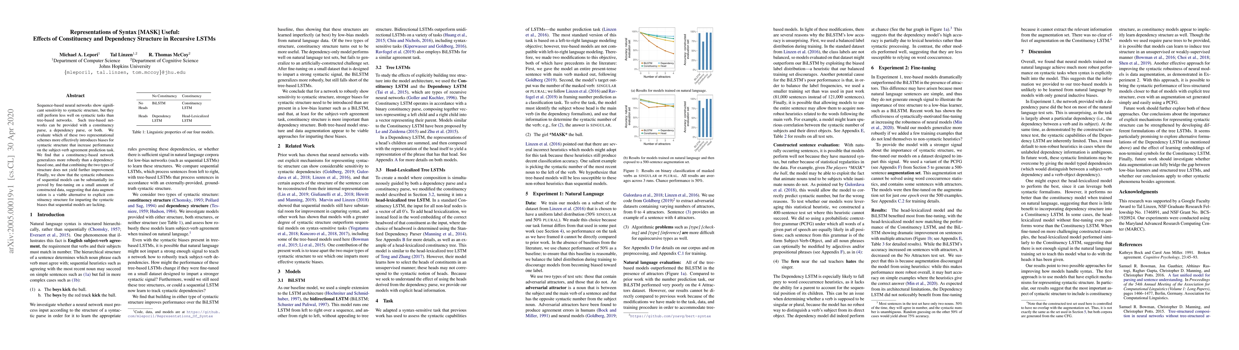 This paper evaluates the effectiveness of constituency versus dependency structures in recursive LSTMs for syntactic tasks, finding that constituency-based networks generalize better than dependency-based ones. It concludes that combining both structures does not further improve performance, and suggests fine-tuning on constructed data can enhance syntactic robustness in sequential models.