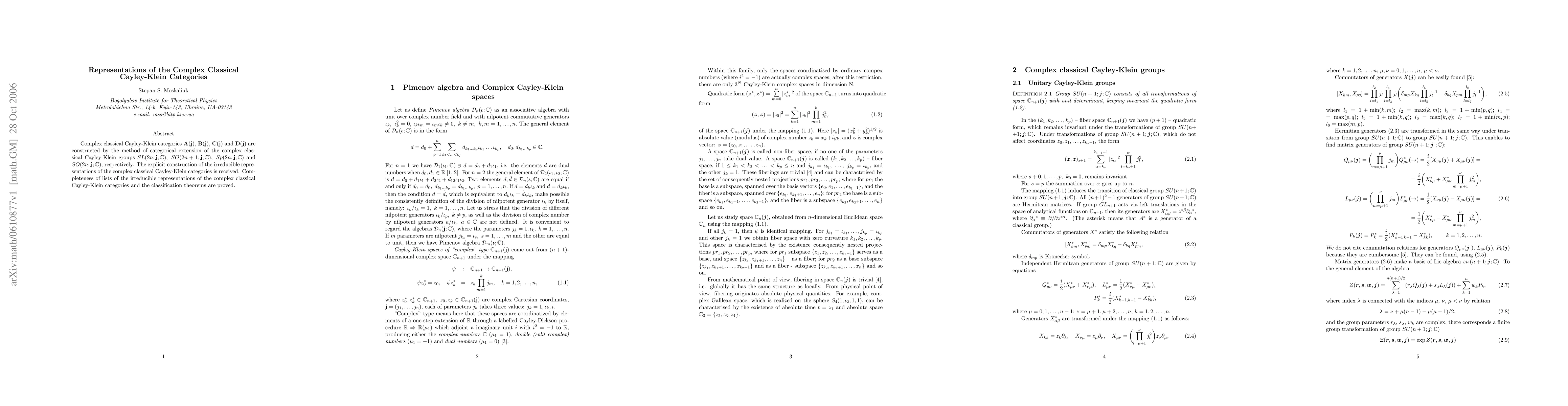 The paper explores the complex classical Cayley-Klein categories and proves the completeness of lists of their irreducible representations, providing a classification framework.