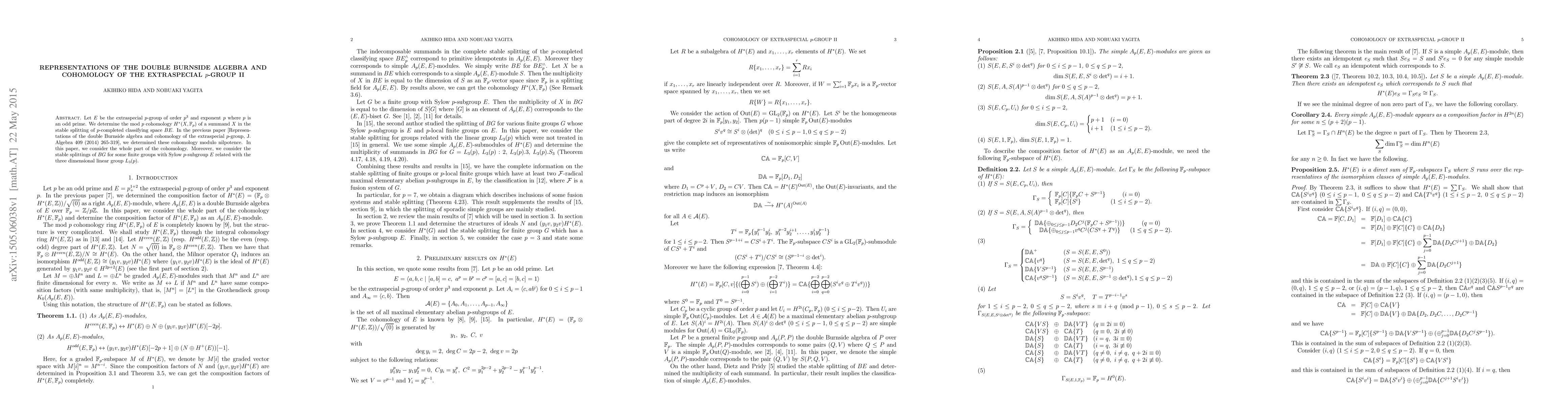 Let E be the extraspecial p-group of order p^3 and exponent p where p is an odd prime. We consider the mod p cohomology of summands in the stable splitting of p-completed classifying space BE. Moreover, we consider the stable splitting for some finite groups with Sylow p-subgroup E.
