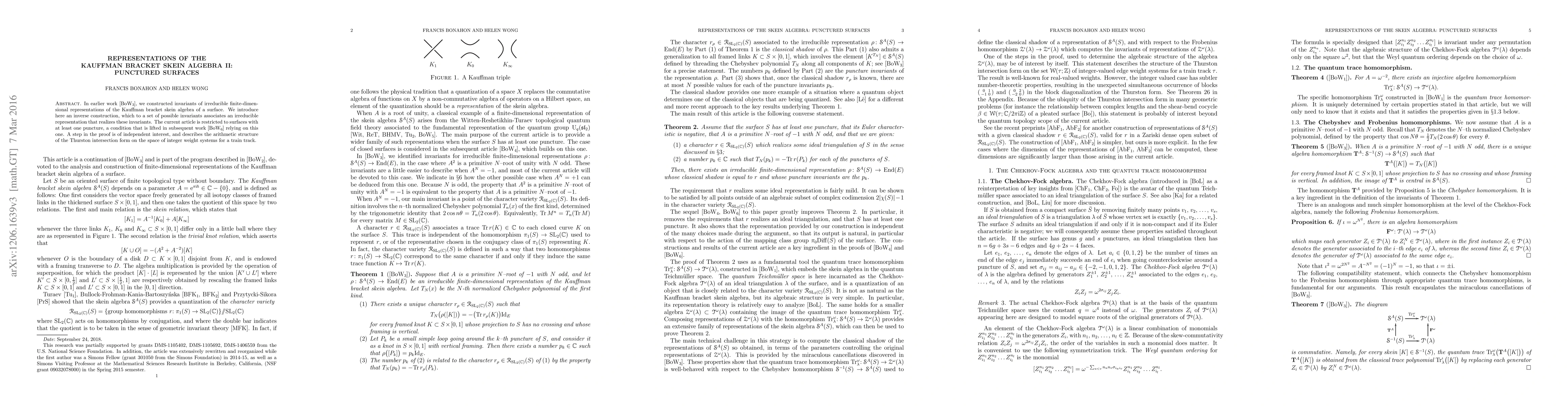 This paper constructs an inverse method to associate a set of invariants with irreducible representations of the Kauffman bracket skein algebra of punctured surfaces. It highlights an independent step in the proof describing the algebraic structure of the Thurston intersection form on train tracks.