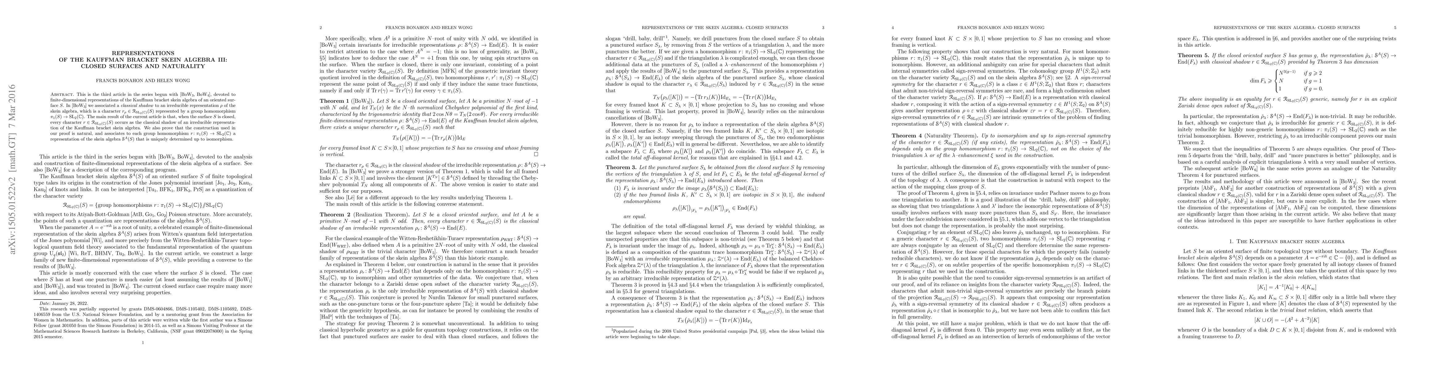 This is the third article in the series begun with [BonWon3, BonWon4], devoted to finite-dimensional representations of the Kauffman bracket skein algebra of an oriented surface $S$. In [BonWon3] we associated a classical shadow to an irreducible representation $\rho$ of the skein algebra, which is a character $r_\rho \in \mathcal R_{\mathrm{SL}_2(\mathbb C)}(S)$ represented by a group homomorphism $\pi_1(S) \to \mathrm{SL}_2(\mathbb C)$. The main result of the current article is that, when the surface $S$ is closed, every character $r\in \mathcal R_{\mathrm{SL}_2(\mathbb C)}(S)$ occurs as the classical shadow of an irreducible representation of the Kauffman bracket skein algebra. We also prove that the construction used in our proof is natural, and associates to each group homomorphism $r\colon \pi_1(S) \to \mathrm{SL}_2(\mathbb C)$ a representation of the skein algebra $\mathcal S^A(S)$ that is uniquely determined up to isomorphism.