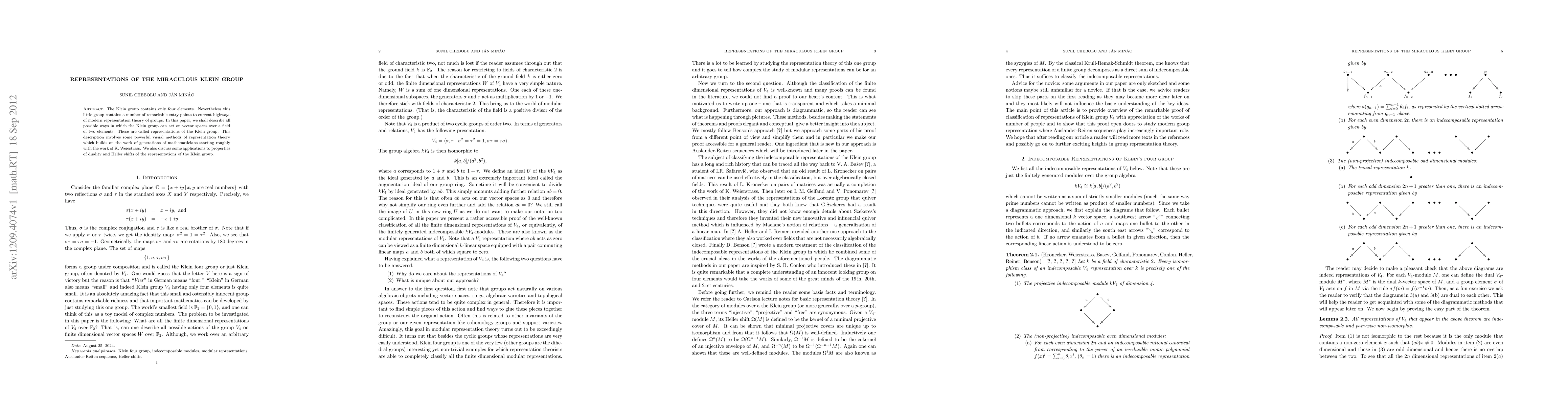 The Klein group contains only four elements. Nevertheless this little group contains a number of remarkable entry points to current highways of modern representation theory of groups. In this paper, we shall describe all possible ways in which the Klein group can act on vector spaces over a field of two elements. These are called representations of the Klein group. This description involves some powerful visual methods of representation theory which builds on the work of generations of mathematicians starting roughly with the work of K. Weiestrass. We also discuss some applications to properties of duality and Heller shifts of the representations of the Klein group.