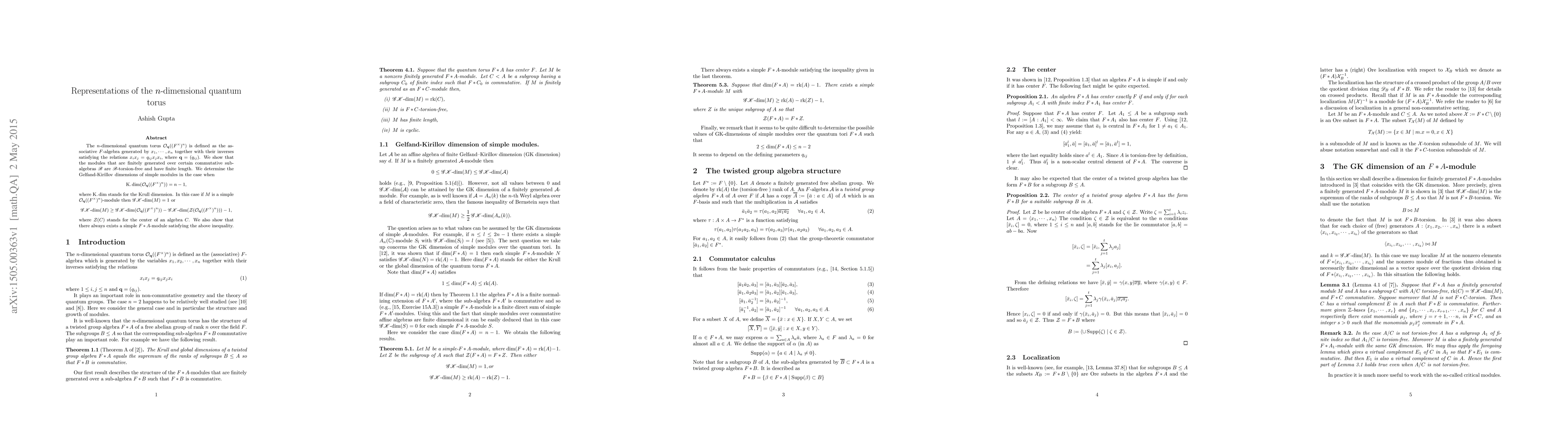 The $n$-dimensional quantum torus $\mathcal O_{\mathbf q}((F^\times)^n)$ is defined as the associative $F$-algebra generated by $x_1, \cdots, x_n$ together with their inverses satisfying the relations $x_ix_j = q_{ij}x_jx_i$, where $\mathbf q = (q_{ij})$. We show that the modules that are finitely generated over certain commutative sub-algebras $\mathscr B$ are $\mathscr B$-torsion-free and have finite length. We determine the Gelfand-Kirillov dimensions of simple modules in the case when \[ \Kdim(\mathcal O_{\mathbf q}((F^\times)^n)) = n - 1, \] where $\Kdim$ stands for the Krull dimension. In this case if $M$ is a simple $\mathcal O_{\mathbf q}((F^\times)^n)$-module then $ \gk(M) = 1$ or \[ \gk(M) \ge \gk(\mathcal O_{\mathbf q}((F^\times)^n)) - \gk(\mathcal Z(\mathcal O_{\mathbf q}((F^\times)^n))) - 1,\] where $\mathcal Z(C)$ stands for the center of an algebra $C$. We also show that there always exists a simple $F \s A$-module satisfying the above inequality.