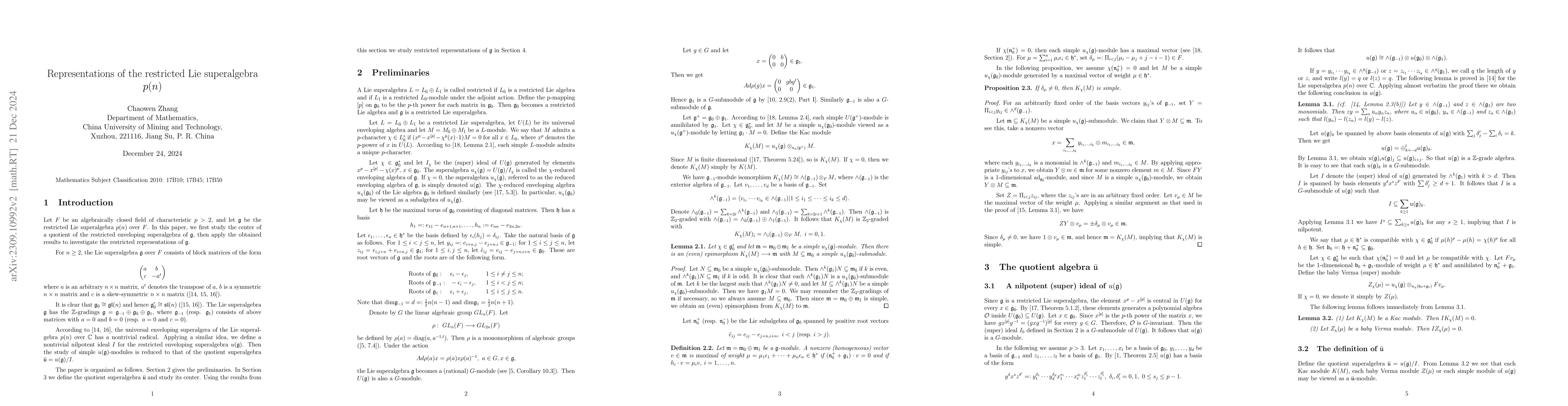 Summary: This paper investigates the center of a quotient of the reduced enveloping algebra of the restricted Lie superalgebra p(n) and uses these findings to explore the restricted representation of p(n).
