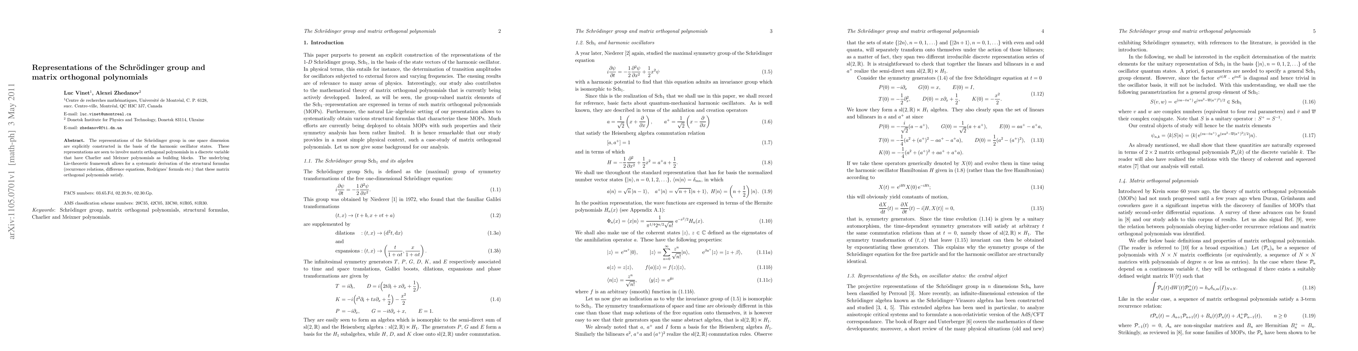 This paper constructs representations of the Schrödinger group using harmonic oscillator states, revealing matrix orthogonal polynomials with Charlier and Meixner polynomials as components. The study employs a Lie-theoretic framework to systematically derive structural formulas for these matrix orthogonal polynomials.