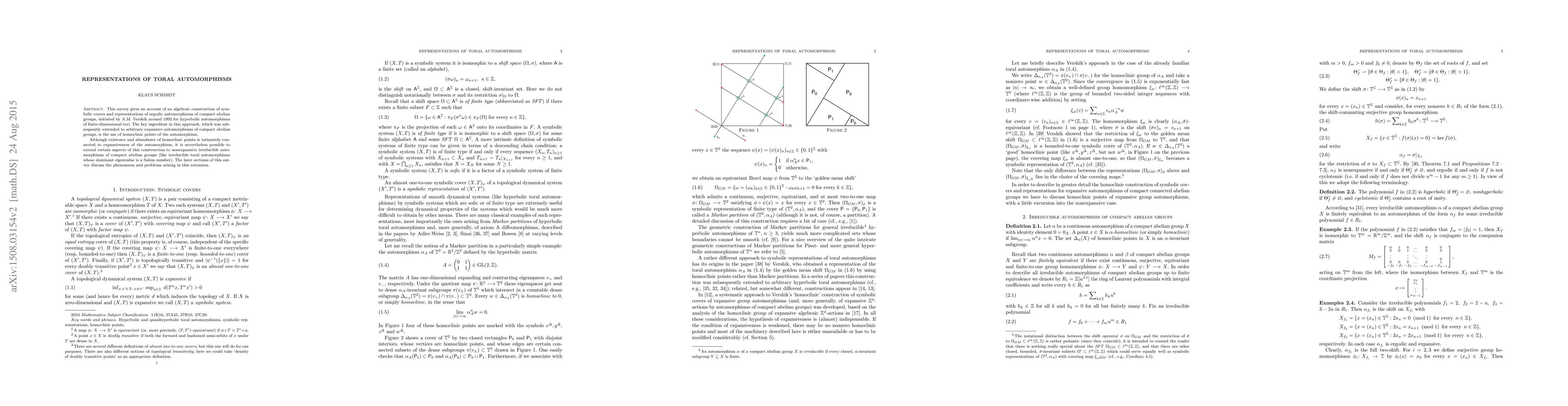 This survey discusses the algebraic construction of symbolic covers and representations for ergodic automorphisms of compact abelian groups, initially developed for hyperbolic toral automorphisms and later extended to expansive automorphisms. It explores the use of homoclinic points, which are crucial for these representations, and extends the construction to certain nonexpansive irreducible automorphisms.