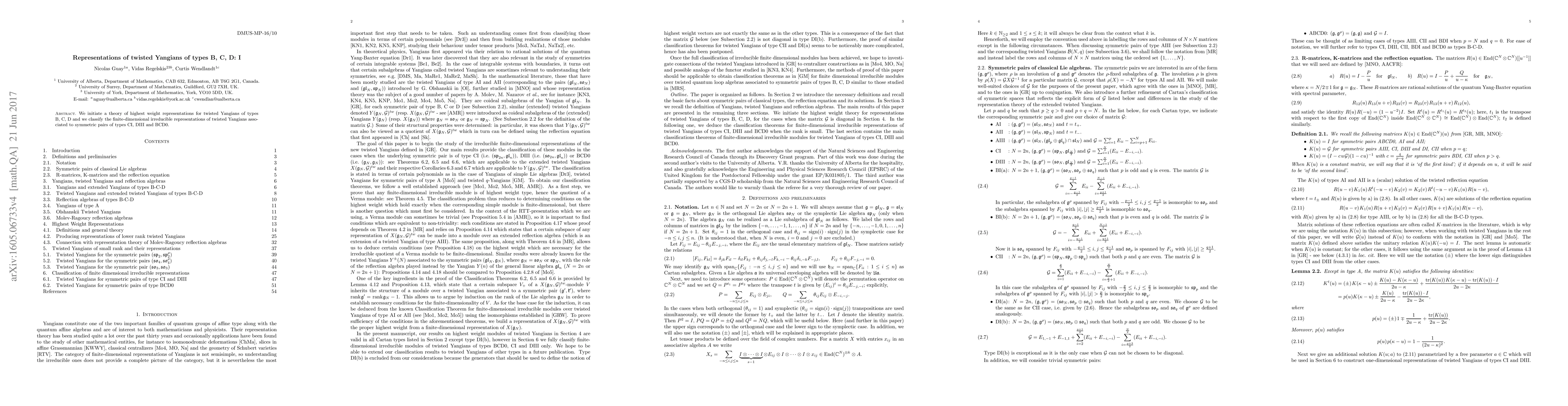 This paper develops a theory for highest weight representations of twisted Yangians of types B, C, D and classifies the finite-dimensional irreducible representations associated with symmetric pairs of types CI, DIII, and BCD0. The focus is on establishing a foundational framework for these algebraic structures.