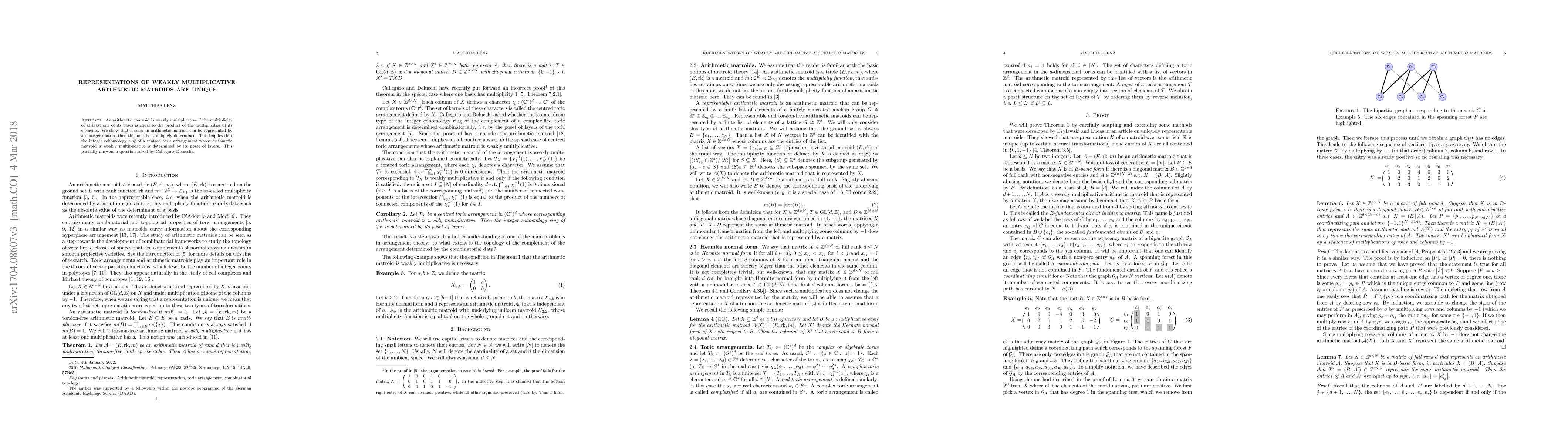 An arithmetic matroid is weakly multiplicative if the multiplicity of at least one of its bases is equal to the product of the multiplicities of its elements. We show that if such an arithmetic matroid can be represented by an integer matrix, then this matrix is uniquely determined. This implies that the integer cohomology ring of a centred toric arrangement whose arithmetic matroid is weakly multiplicative is determined by its poset of layers. This partially answers a question asked by Callegaro-Delucchi.
