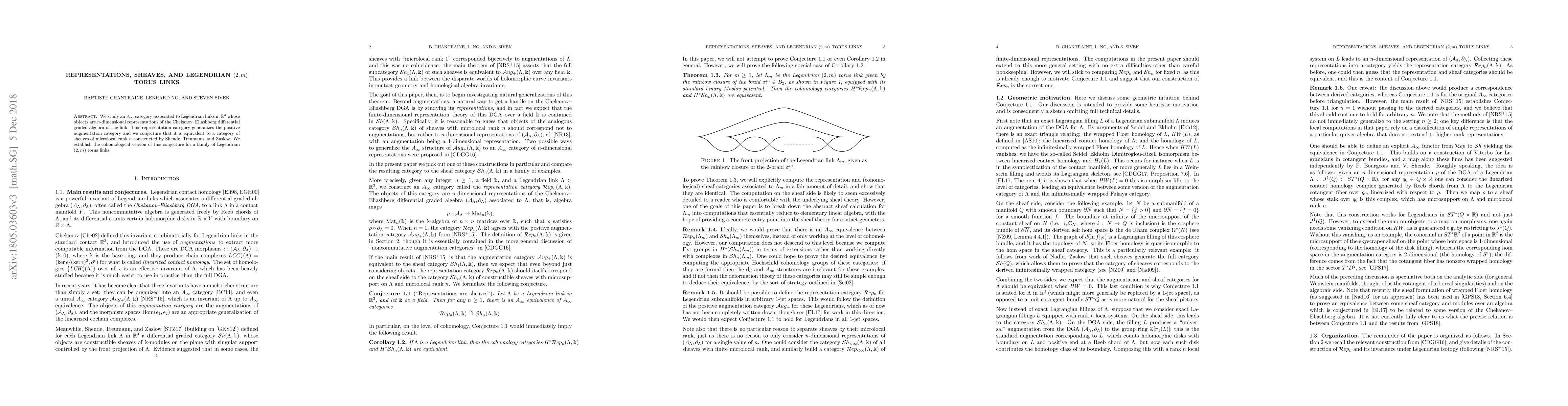 This paper explores an $A_\infty$ category linked to Legendrian knots in $\mathbb{R}^3$, using representations of the Chekanov-Eliashberg algebra. It conjectures an equivalence to a sheaf category and proves this cohomologically for specific $(2,m)$ torus links.
