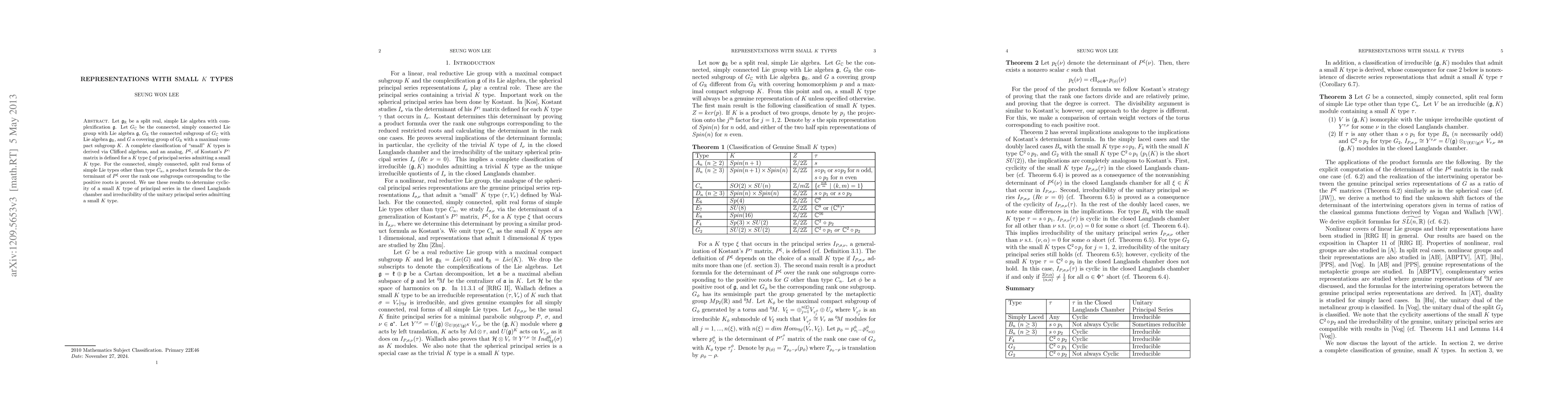 Let $\mathfrak{g}_{\mathbb{R}}$ be a split real, simple Lie algebra with complexification $\mathfrak{g}$. Let $G_{\mathbb{C}}$ be the connected, simply connected Lie group with Lie algebra $\mathfrak{g}$, $G_{\mathbb{R}}$ the connected subgroup of $G_{\mathbb{C}}$ with Lie algebra $\mathfrak{g}_{\mathbb{R}}$, and $G$ a covering group of $G_{\mathbb{R}}$ with a maximal compact subgroup $K$. A complete classification of "small" $K$ types is derived via Clifford algebras, and an analog, $P^{\xi}$, of Kostant's $P^{\gamma}$ matrix is defined for a $K$ type ${\xi}$ of principal series admitting a small $K$ type. For the connected, simply connected, split real forms of simple Lie types other than type $C_n$, a product formula for the determinant of $P^{\xi}$ over the rank one subgroups corresponding to the positive roots is proved. We use these results to determine cyclicity of a small $K$ type of principal series in the closed Langlands chamber and irreducibility of the unitary principal series admitting a small $K$ type.