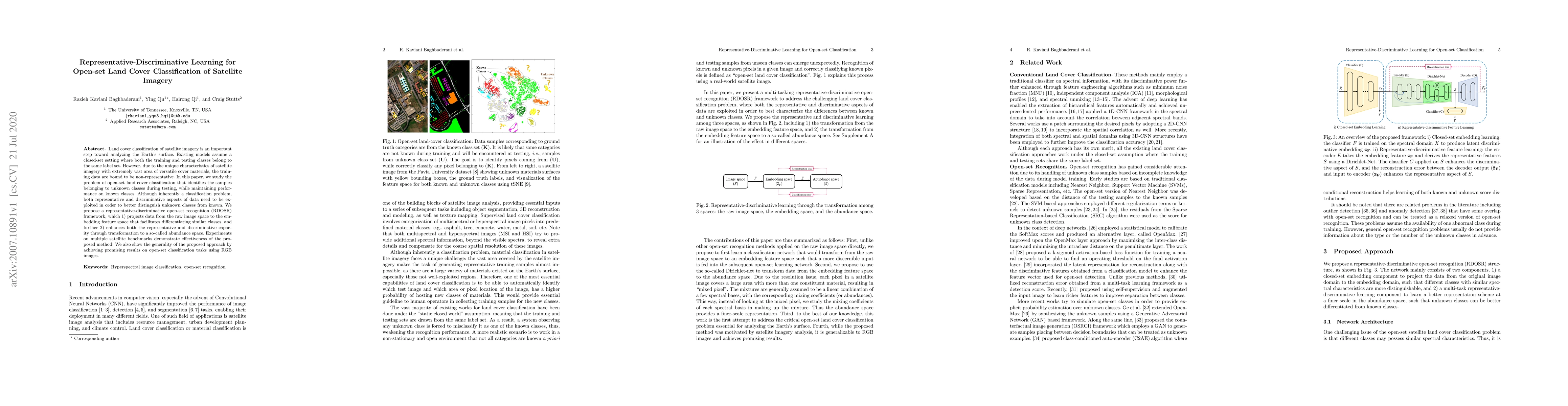 The research proposes a Representative-Discriminative Open-set Recognition (RDOSR) framework for open-set land cover classification of satellite imagery, transforming data from raw image space to an embedding feature space and further to an abundance space to distinguish similar classes and enhance both representative and discriminative capacities.