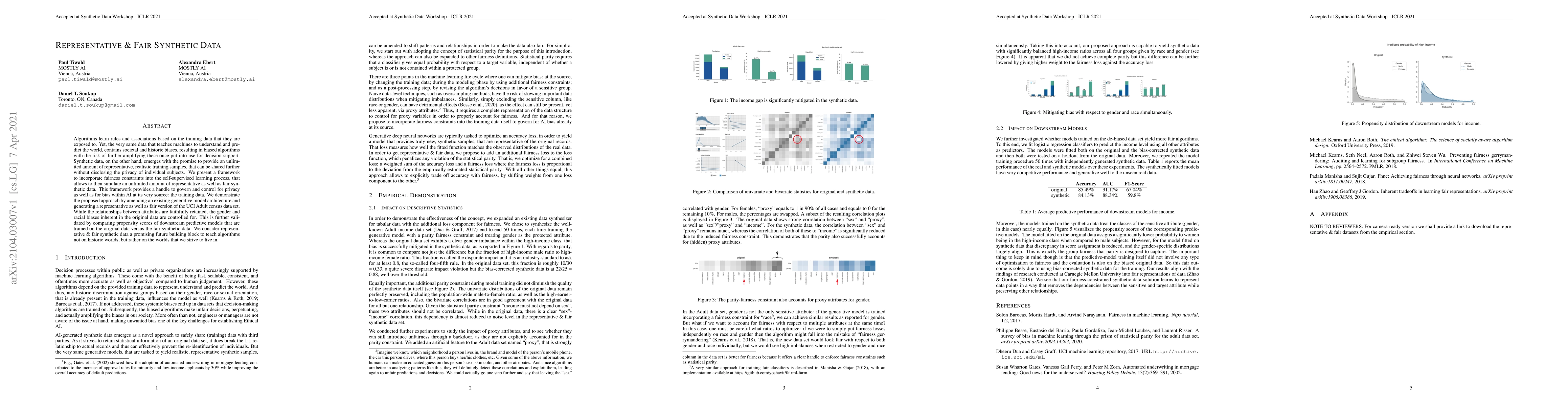 Algorithms learn rules and associations based on the training data that they are exposed to. Yet, the very same data that teaches machines to understand and predict the world, contains societal and historic biases, resulting in biased algorithms with the risk of further amplifying these once put into use for decision support. Synthetic data, on the other hand, emerges with the promise to provide an unlimited amount of representative, realistic training samples, that can be shared further without disclosing the privacy of individual subjects. We present a framework to incorporate fairness constraints into the self-supervised learning process, that allows to then simulate an unlimited amount of representative as well as fair synthetic data. This framework provides a handle to govern and control for privacy as well as for bias within AI at its very source: the training data. We demonstrate the proposed approach by amending an existing generative model architecture and generating a representative as well as fair version of the UCI Adult census data set. While the relationships between attributes are faithfully retained, the gender and racial biases inherent in the original data are controlled for. This is further validated by comparing propensity scores of downstream predictive models that are trained on the original data versus the fair synthetic data. We consider representative & fair synthetic data a promising future building block to teach algorithms not on historic worlds, but rather on the worlds that we strive to live in.