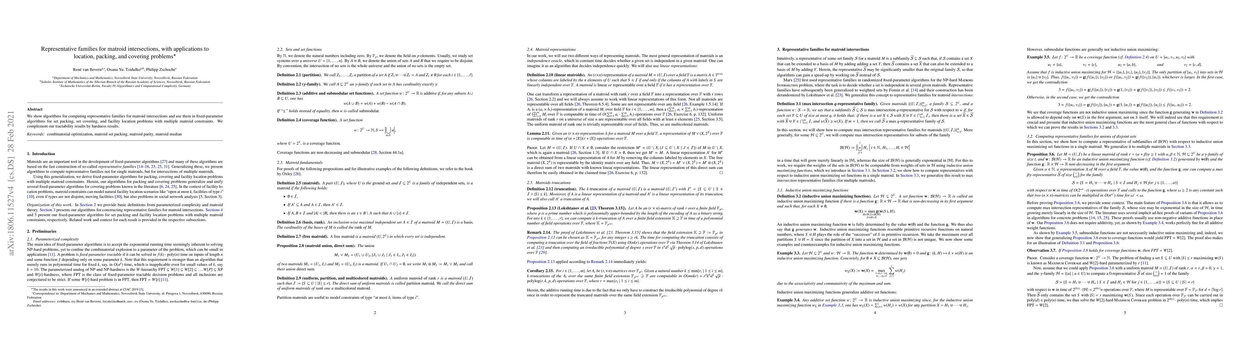 Summary: This paper develops algorithms to compute representative families for matroid intersections, applying these techniques to design fixed-parameter algorithms for set packing, set covering, and facility location problems under multiple matroid constraints, and also presents corresponding hardness results.