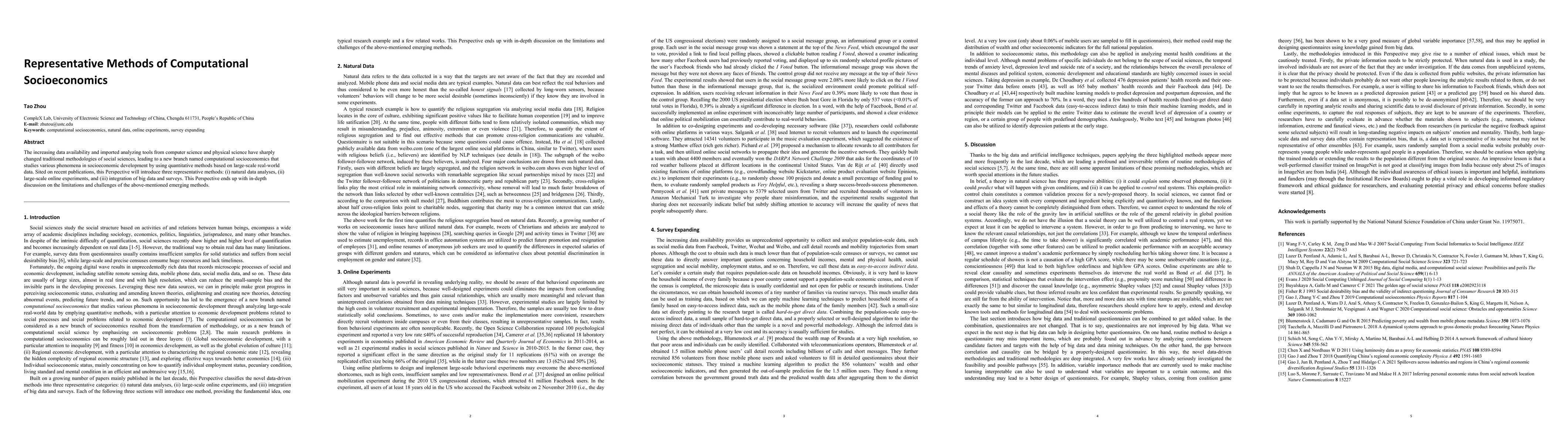 The increasing data availability and imported analyzing tools from computer science and physical science have sharply changed traditional methodologies of social sciences, leading to a new branch named computational socioeconomics that studies various phenomena in socioeconomic development by using quantitative methods based on large-scale real-world data. Sited on recent publications, this Perspective will introduce three representative methods: (i) natural data analyses, (ii) large-scale online experiments, and (iii) integration of big data and surveys. This Perspective ends up with in-depth discussion on the limitations and challenges of the above-mentioned emerging methods.