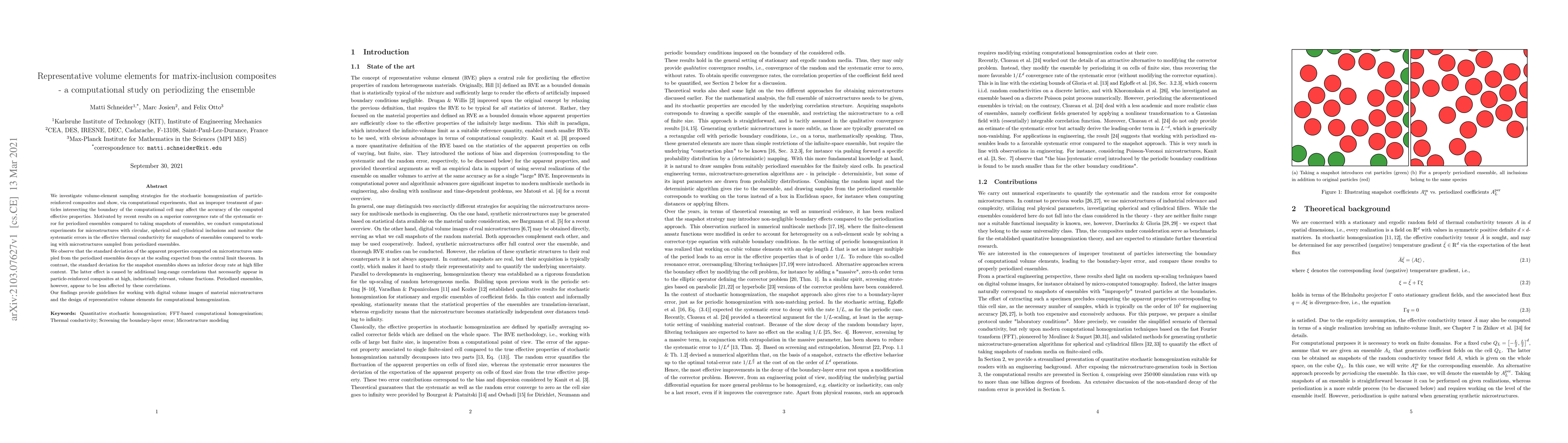 We investigate volume-element sampling strategies for the stochastic homogenization of particle-reinforced composites and show, via computational experiments, that an improper treatment of particles intersecting the boundary of the computational cell may affect the accuracy of the computed effective properties. Motivated by recent results on a superior convergence rate of the systematic error for periodized ensembles compared to taking snapshots of ensembles, we conduct computational experiments for microstructures with circular, spherical and cylindrical inclusions and monitor the systematic errors in the effective thermal conductivity for snapshots of ensembles compared to working with microstructures sampled from periodized ensembles. We observe that the standard deviation of the apparent properties computed on microstructures sampled from the periodized ensembles decays at the scaling expected from the central limit theorem. In contrast, the standard deviation for the snapshot ensembles shows an inferior decay rate at high filler content. The latter effect is caused by additional long-range correlations that necessarily appear in particle-reinforced composites at high, industrially relevant, volume fractions. Periodized ensembles, however, appear to be less affected by these correlations. Our findings provide guidelines for working with digital volume images of material microstructures and the design of representative volume elements for computational homogenization.