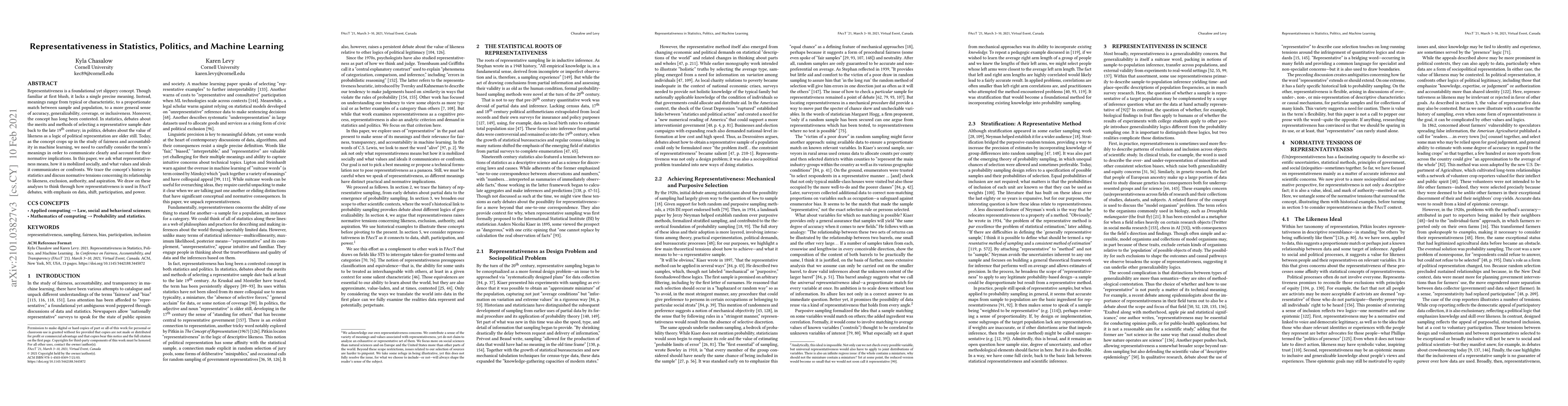 Representativeness is a foundational yet slippery concept. Though familiar at first blush, it lacks a single precise meaning. Instead, meanings range from typical or characteristic, to a proportionate match between sample and population, to a more general sense of accuracy, generalizability, coverage, or inclusiveness. Moreover, the concept has long been contested. In statistics, debates about the merits and methods of selecting a representative sample date back to the late 19th century; in politics, debates about the value of likeness as a logic of political representation are older still. Today, as the concept crops up in the study of fairness and accountability in machine learning, we need to carefully consider the term's meanings in order to communicate clearly and account for their normative implications. In this paper, we ask what representativeness means, how it is mobilized socially, and what values and ideals it communicates or confronts. We trace the concept's history in statistics and discuss normative tensions concerning its relationship to likeness, exclusion, authority, and aspiration. We draw on these analyses to think through how representativeness is used in FAccT debates, with emphasis on data, shift, participation, and power.