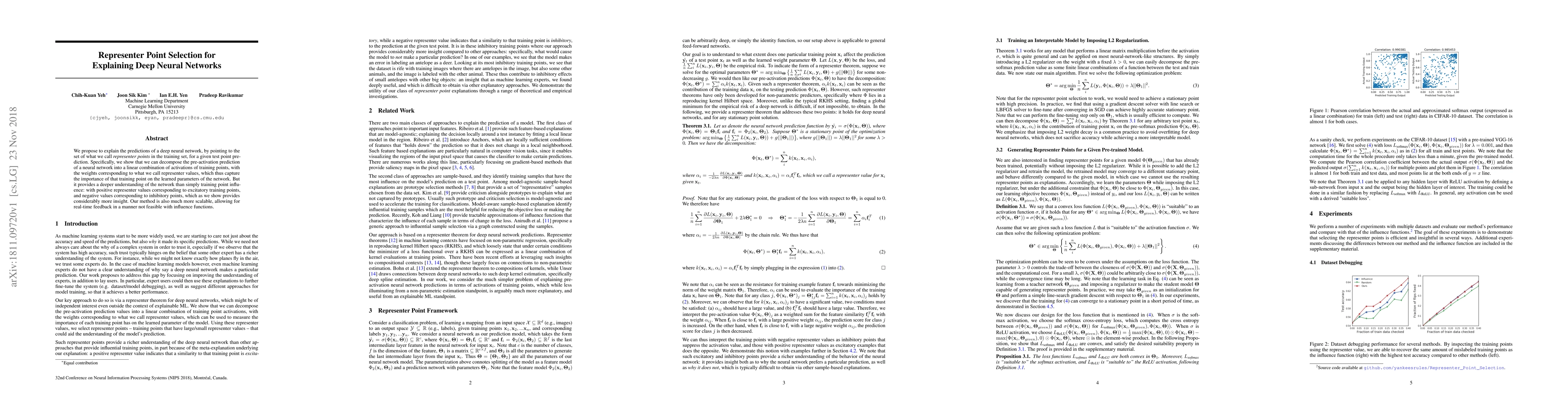 This paper proposes a method for explaining deep neural network predictions by identifying "representer points" in the training set, which are crucial for understanding the network's learned parameters. The method decomposes the network's pre-activation prediction into a linear combination of training points' activations, providing scalable, real-time feedback insights beyond simple training point influence.