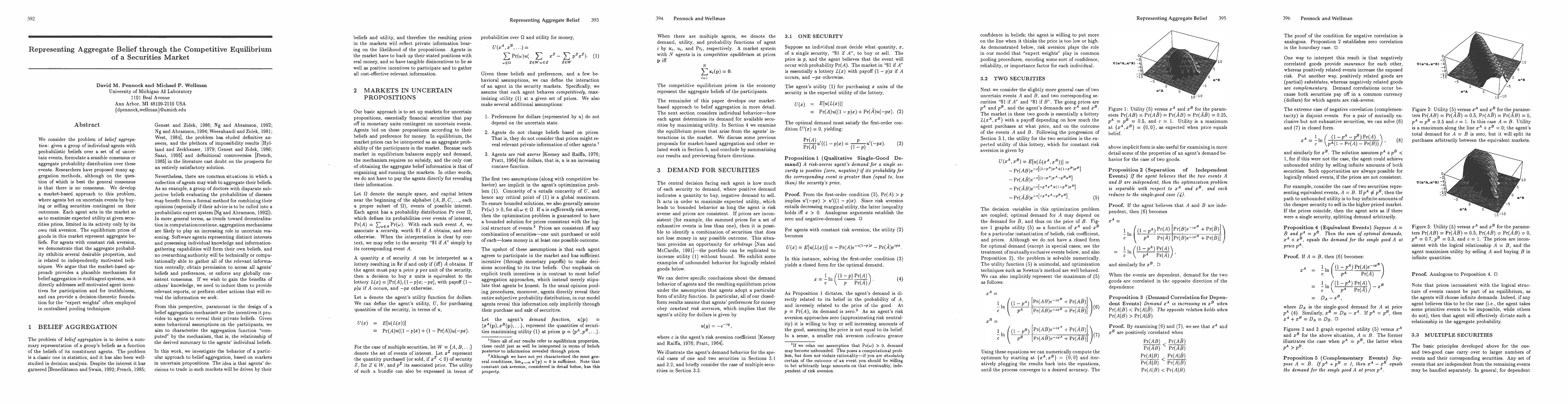 This paper proposes a market-based method for aggregating beliefs of individual agents, where they trade securities contingent on uncertain events. The equilibrium prices in this market represent collective beliefs, demonstrated to have desirable properties for agents with constant risk aversion. The approach offers a decision-theoretic foundation for belief pooling, addressing agent incentives for participation and truthfulness.
