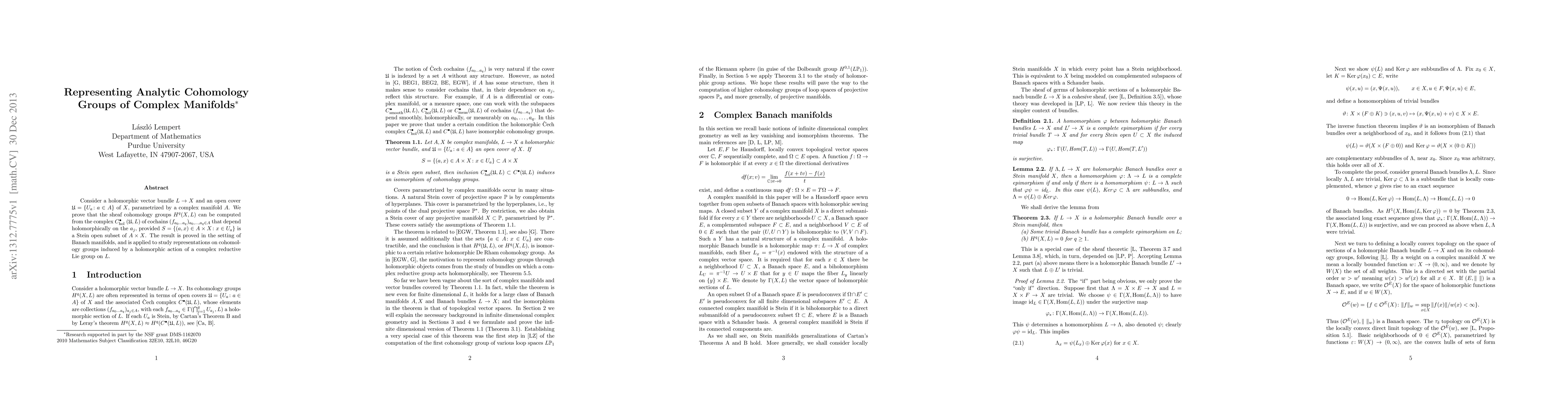 Consider a holomorphic vector bundle $L\to X$ and an open cover ${\frak U}=\{U_a\colon a\in A\}$ of $X$, parametrized by a complex manifold $A$. We prove that the sheaf cohomology groups $H^q(X,L)$ can be computed from the complex $C^{\bullet}_{\text{hol}}$ $({\frak U},L)$ of cochains $(f_{a_0\ldots a_q})_{a_0,\ldots, a_q\in A}$ that depend holomorphically on the $a_j$, provided $S=\{(a,x)\in A\times X\colon x\in U_a\}$ is a Stein open subset of $A\times X$. The result is proved in the setting of Banach manifolds, and is applied to study representations on cohomology groups induced by a holomorphic action of a complex reductive Lie group on $L$.