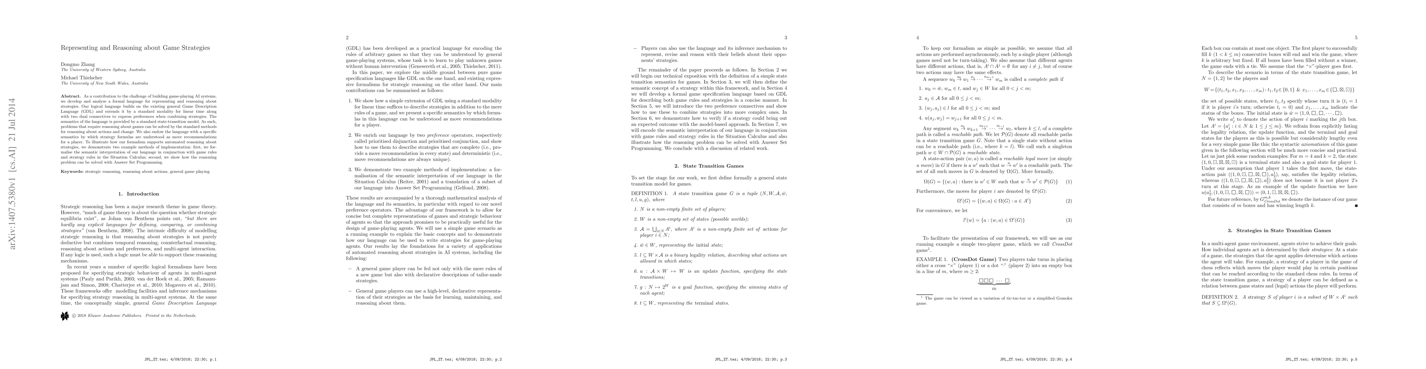 This paper develops a formal language to represent and reason about game strategies, extending the Game Description Language (GDL) with a linear time modality and dual connectives for strategy preferences. It demonstrates the use of the Situation Calculus and Answer Set Programming for automated reasoning about these strategies.