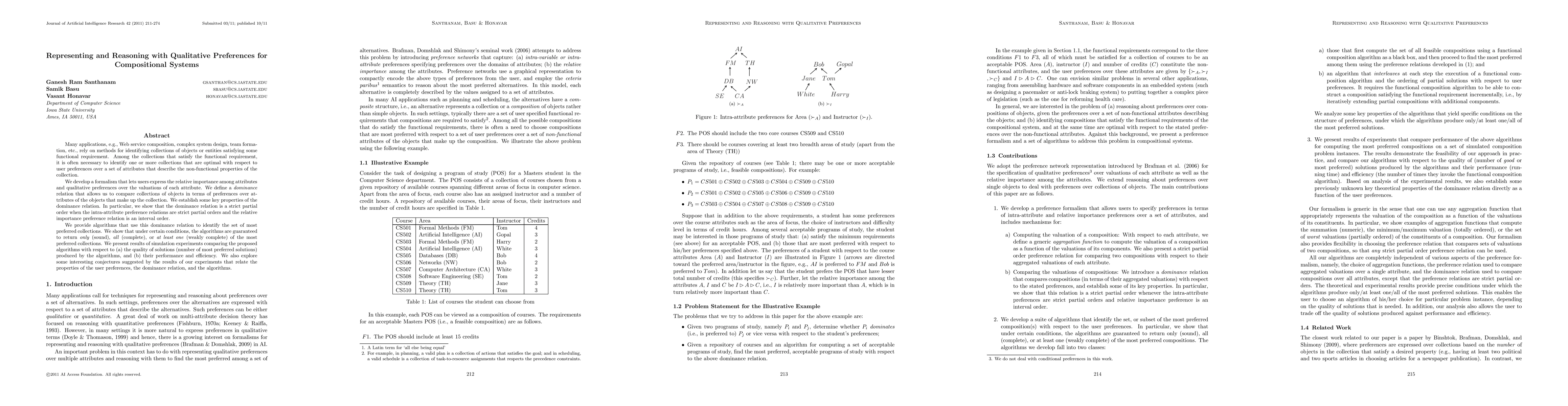 Researchers developed a formalism to represent and reason with qualitative preferences for compositional systems, enabling users to express relative importance among attributes and preferences over attribute valuations. The framework provides algorithms to identify the most preferred collections, offering trade-offs between solution quality, completeness, and efficiency.