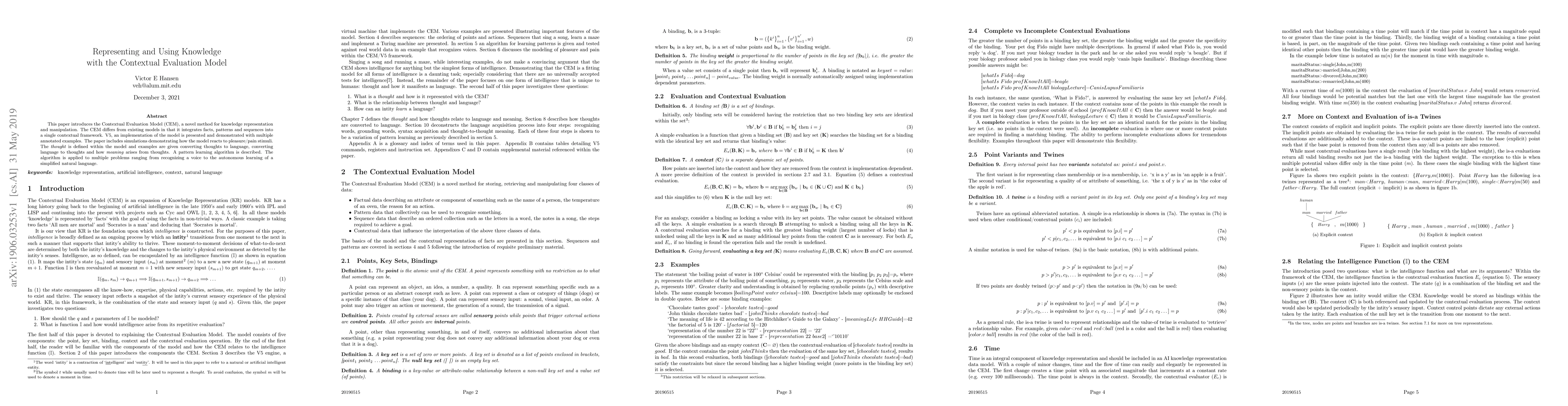 This paper introduces the Contextual Evaluation Model (CEM), a novel method for knowledge representation and manipulation. The CEM differs from existing models in that it integrates facts, patterns and sequences into a single contextual framework. V5, an implementation of the model is presented and demonstrated with multiple annotated examples. The paper includes simulations demonstrating how the model reacts to pleasure/pain stimuli. The 'thought' is defined within the model and examples are given converting thoughts to language, converting language to thoughts and how 'meaning' arises from thoughts. A pattern learning algorithm is described. The algorithm is applied to multiple problems ranging from recognizing a voice to the autonomous learning of a simplified natural language.