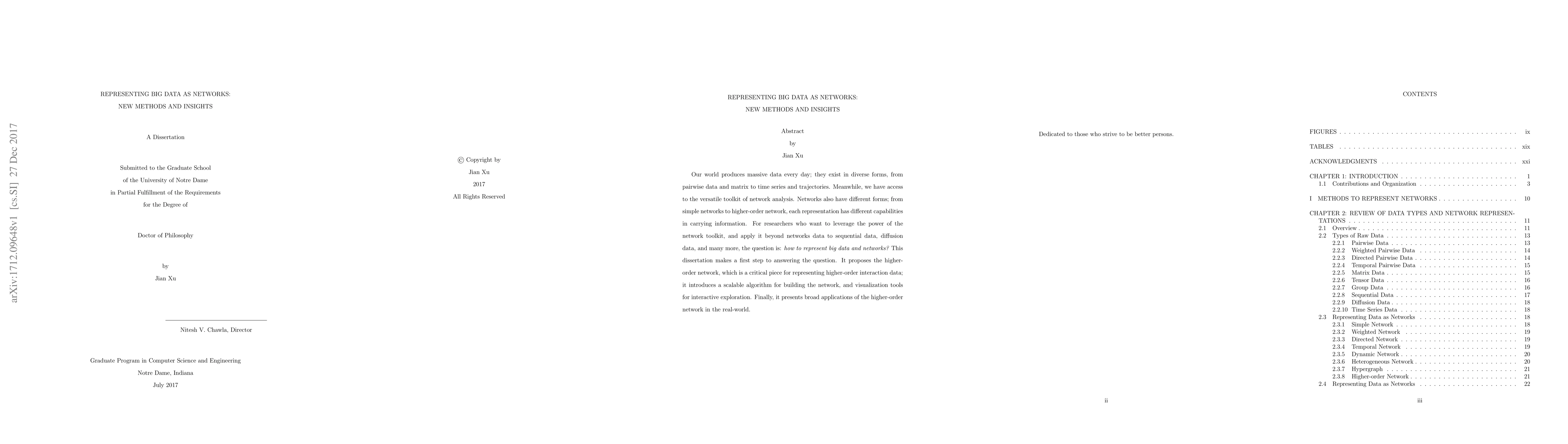 Our world produces massive data every day; they exist in diverse forms, from pairwise data and matrix to time series and trajectories. Meanwhile, we have access to the versatile toolkit of network analysis. Networks also have different forms; from simple networks to higher-order network, each representation has different capabilities in carrying information. For researchers who want to leverage the power of the network toolkit, and apply it beyond networks data to sequential data, diffusion data, and many more, the question is: how to represent big data and networks? This dissertation makes a first step to answering the question. It proposes the higher-order network, which is a critical piece for representing higher-order interaction data; it introduces a scalable algorithm for building the network, and visualization tools for interactive exploration. Finally, it presents broad applications of the higher-order network in the real-world.