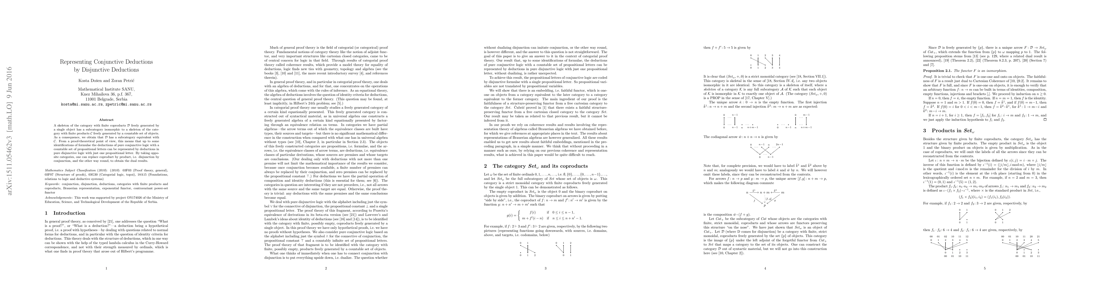This paper demonstrates that a subcategory of a category with finite coproducts (D) is equivalent to a category with finite products (C), showing that conjunctive logic deductions can be represented by disjunctive logic deductions, and vice versa, through appropriate identifications. This equivalence highlights the structural similarity between conjunctive and disjunctive logics.
