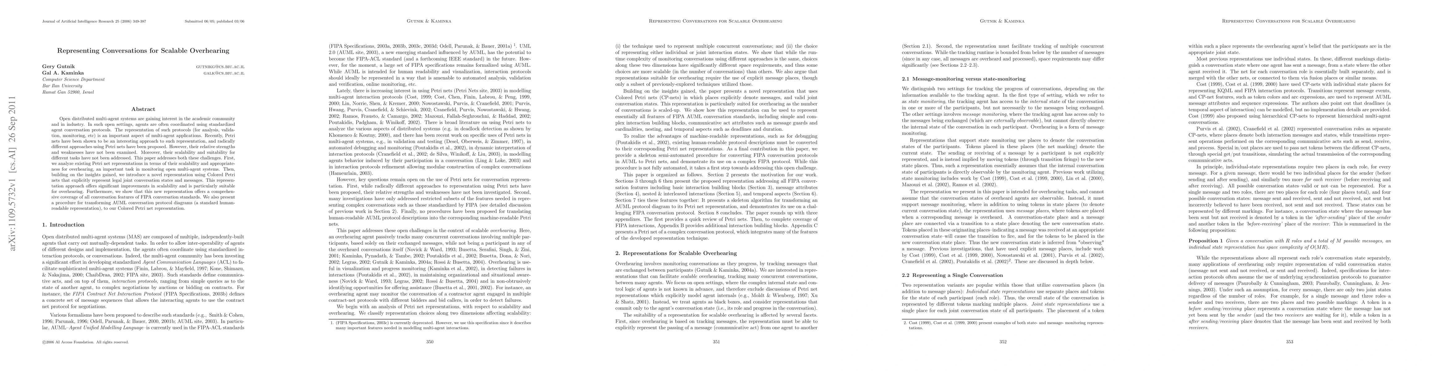 This paper analyzes existing Petri net representations for their scalability and suitability for overhearing in open multi-agent systems, introducing a novel Colored Petri net approach that significantly improves scalability and offers comprehensive coverage of FIPA conversation standards. It also presents a transformation procedure from AUML to the new Colored Petri net representation.