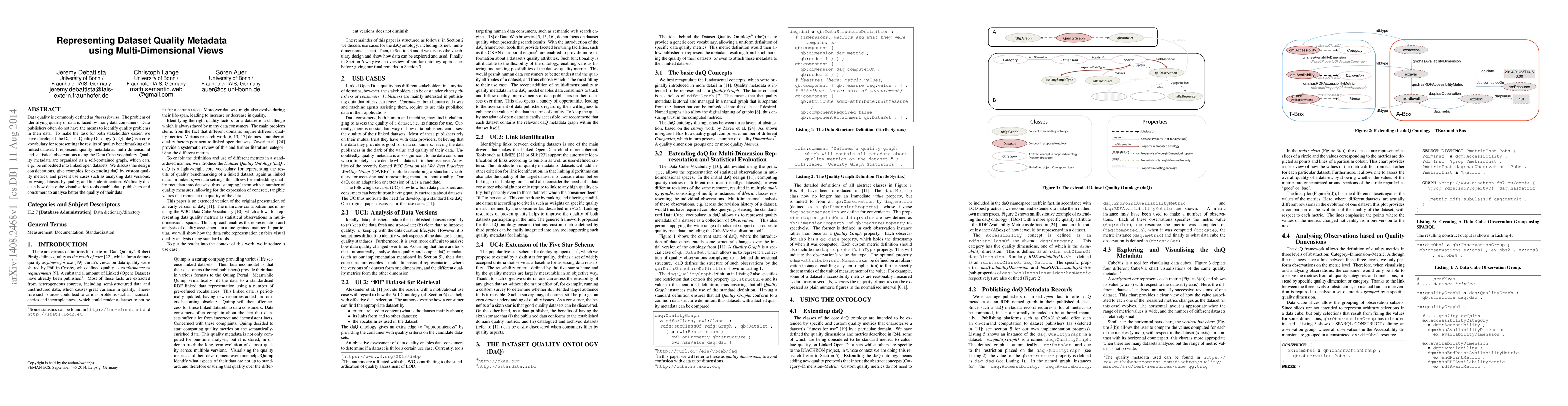 Data quality is commonly defined as fitness for use. The problem of identifying quality of data is faced by many data consumers. Data publishers often do not have the means to identify quality problems in their data. To make the task for both stakeholders easier, we have developed the Dataset Quality Ontology (daQ). daQ is a core vocabulary for representing the results of quality benchmarking of a linked dataset. It represents quality metadata as multi-dimensional and statistical observations using the Data Cube vocabulary. Quality metadata are organised as a self-contained graph, which can, e.g., be embedded into linked open datasets. We discuss the design considerations, give examples for extending daQ by custom quality metrics, and present use cases such as analysing data versions, browsing datasets by quality, and link identification. We finally discuss how data cube visualisation tools enable data publishers and consumers to analyse better the quality of their data.